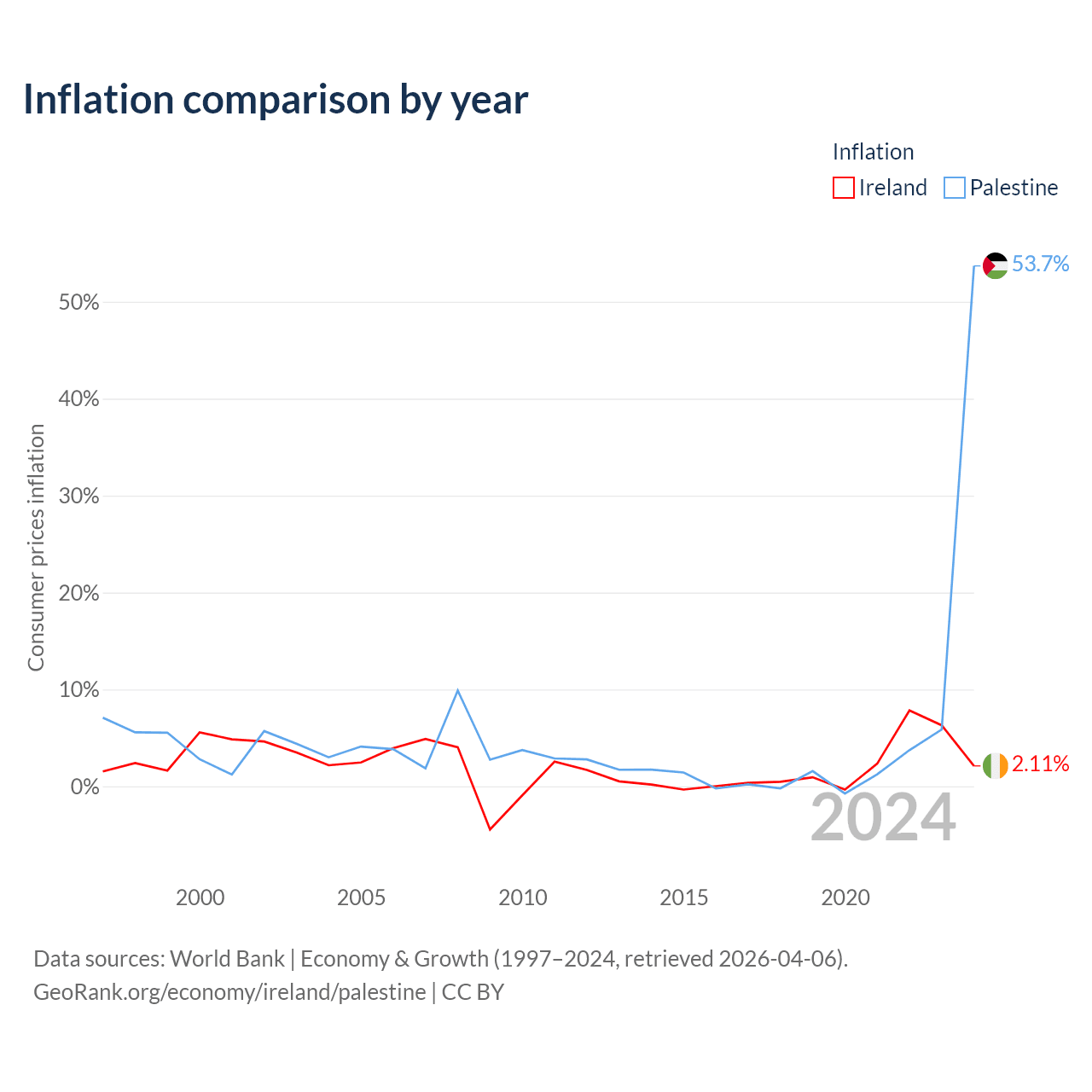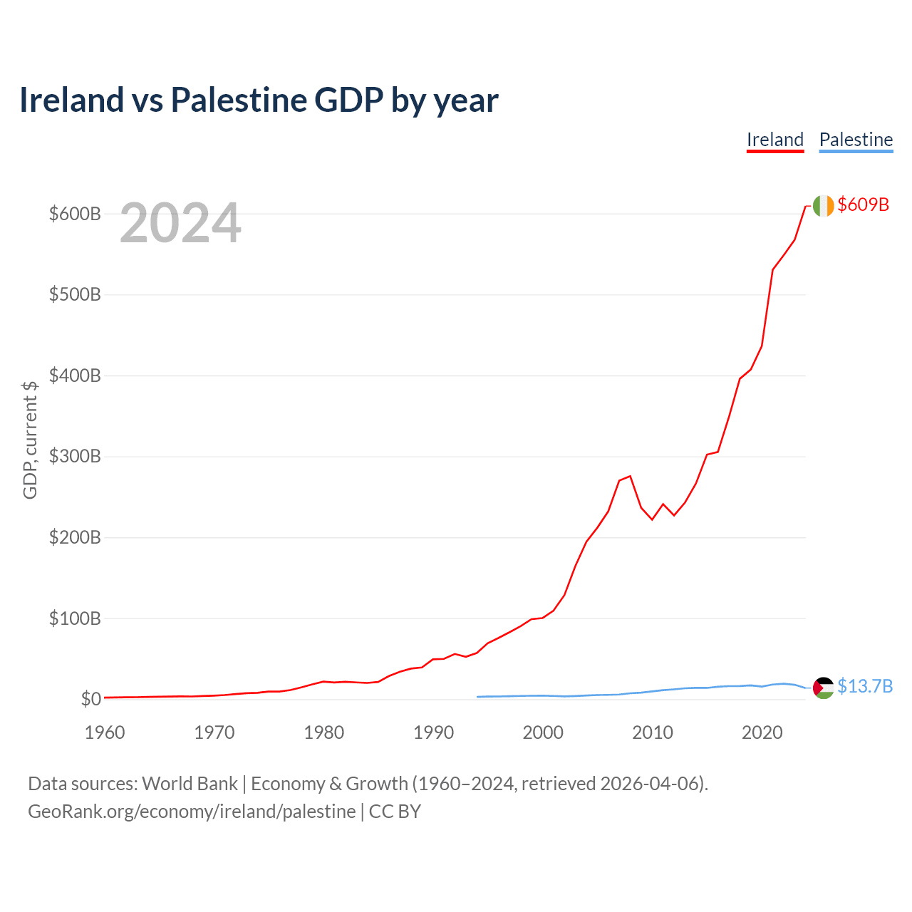 Ireland has a GDP of $609B compared to $13.7B for Palestine, ranking 25/197 and 146/197 by economy size, respectively.