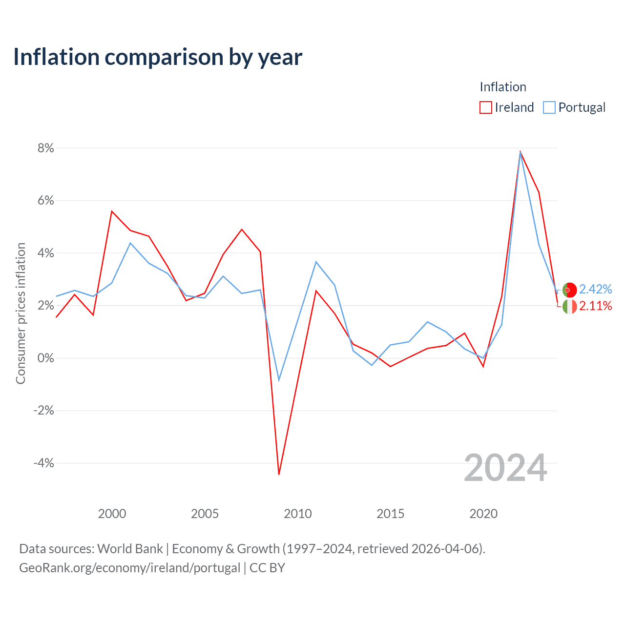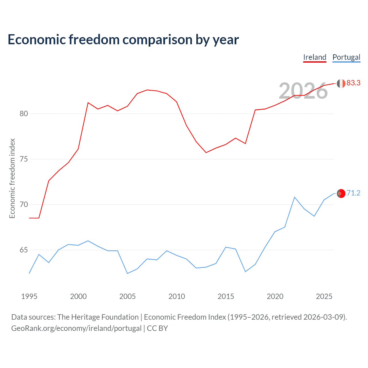 The Economic Freedom Index for Ireland is 83.3, ranking 3/197, compared to 71.2 for Portugal, ranking 33/197. The chart above displays a comparison of annual changes in economic freedom indexes.