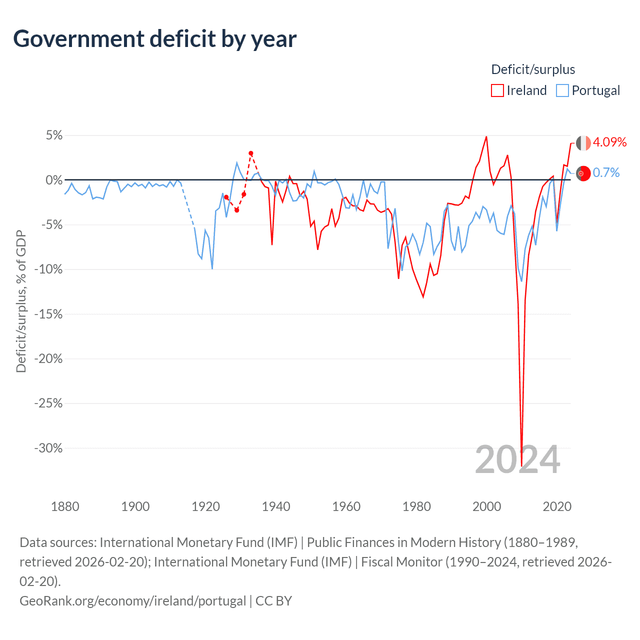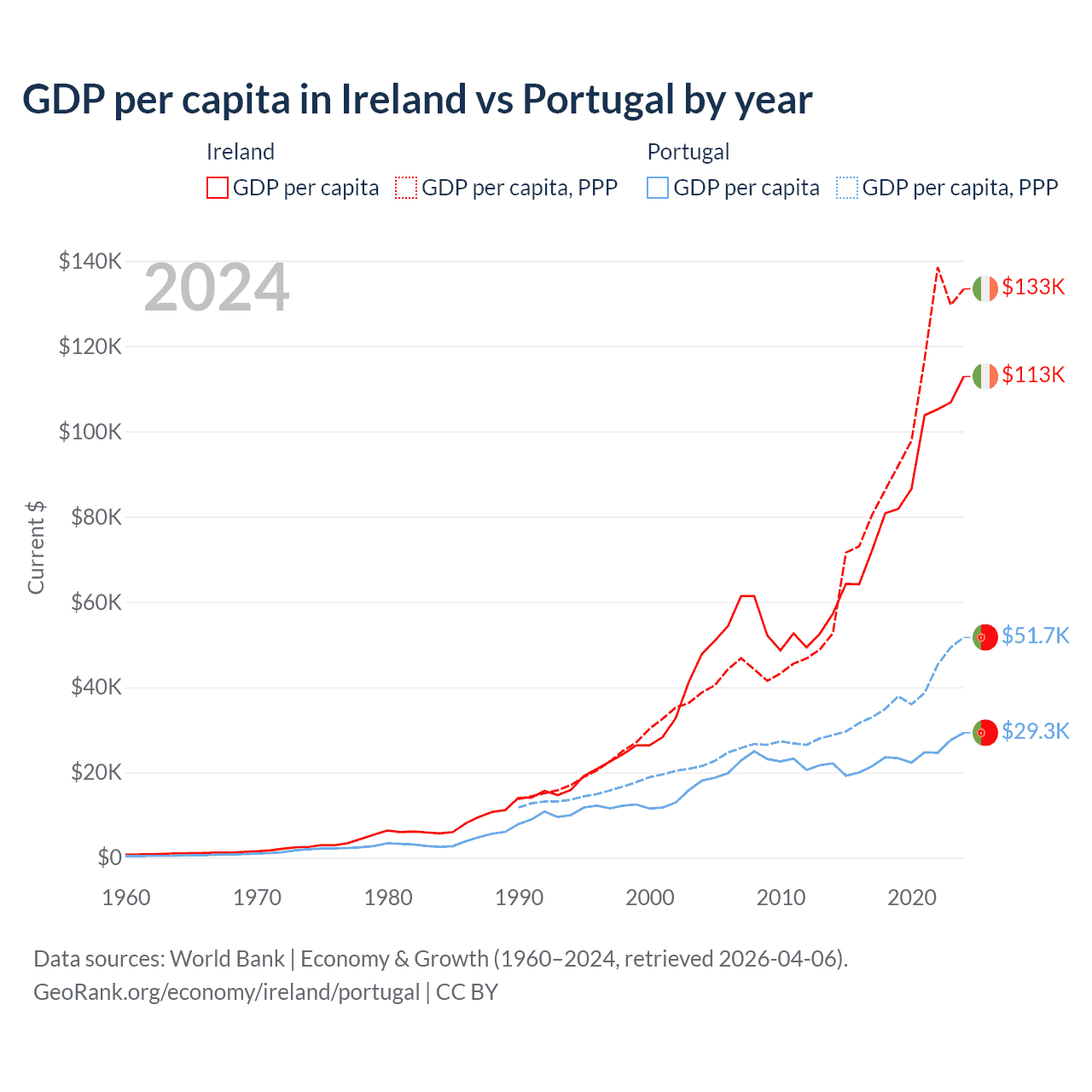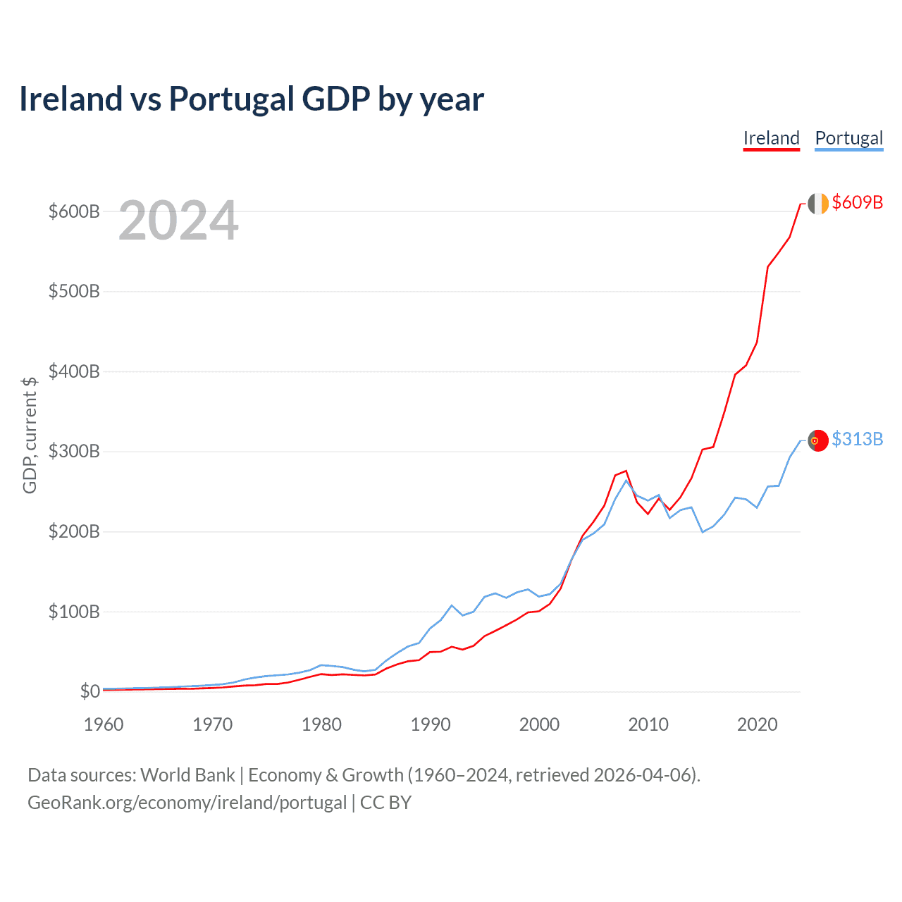 Ireland has a GDP of $609B compared to $313B for Portugal, ranking 25/197 and 46/197 by economy size, respectively.