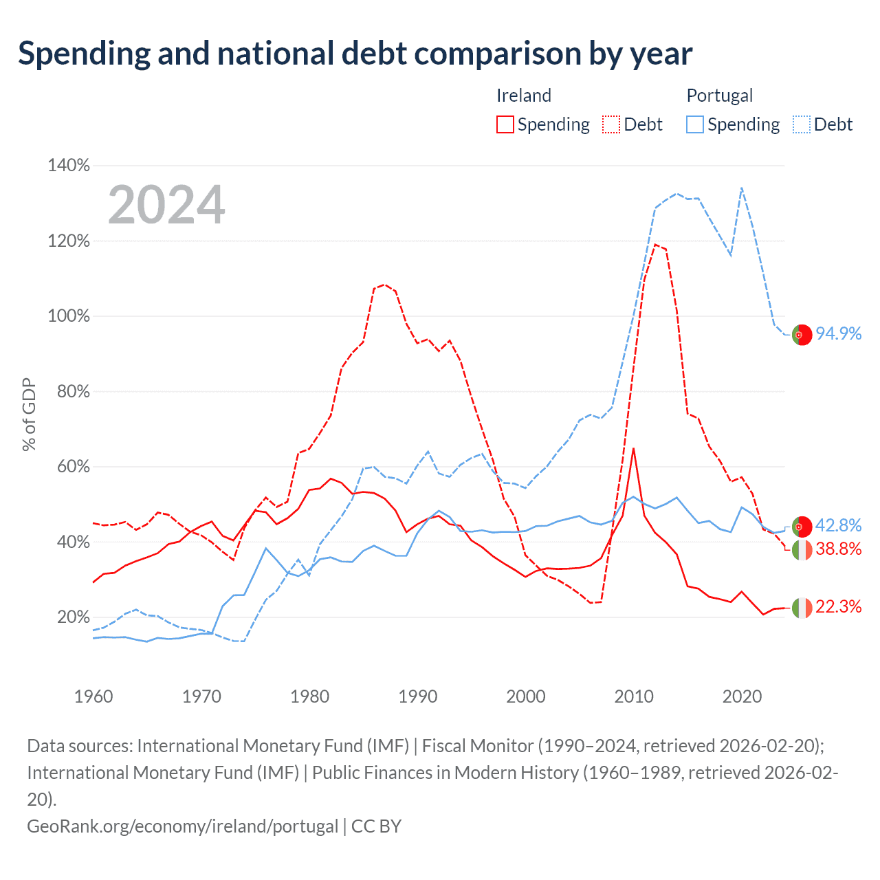 Ireland has $236B in government debt (38.8% of GDP), compared to $297B (94.9% of GDP) in Portugal.