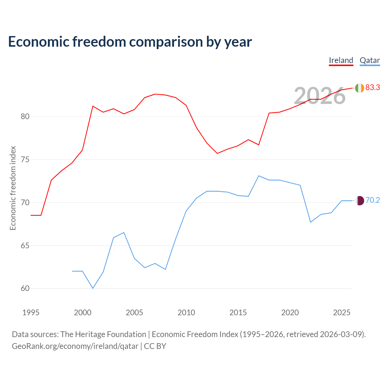 The Economic Freedom Index for Ireland is 83.3, ranking 3/197, compared to 70.2 for Qatar, ranking 37/197. The chart above displays a comparison of annual changes in economic freedom indexes.