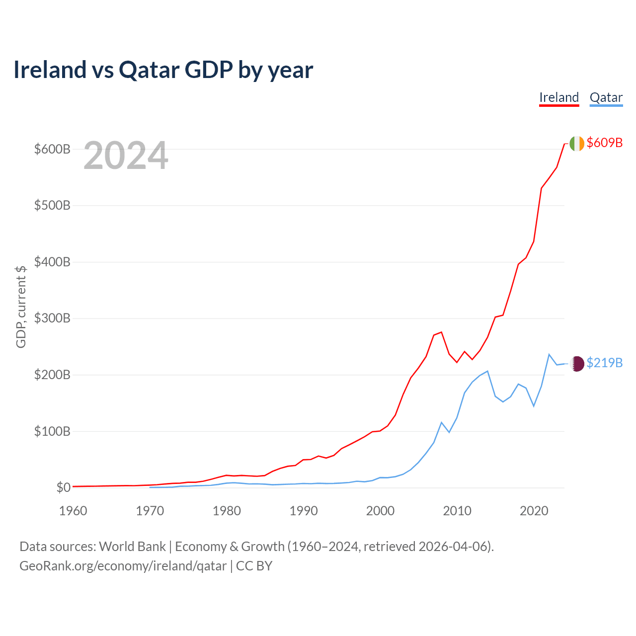 Ireland vs Qatar GDP by year