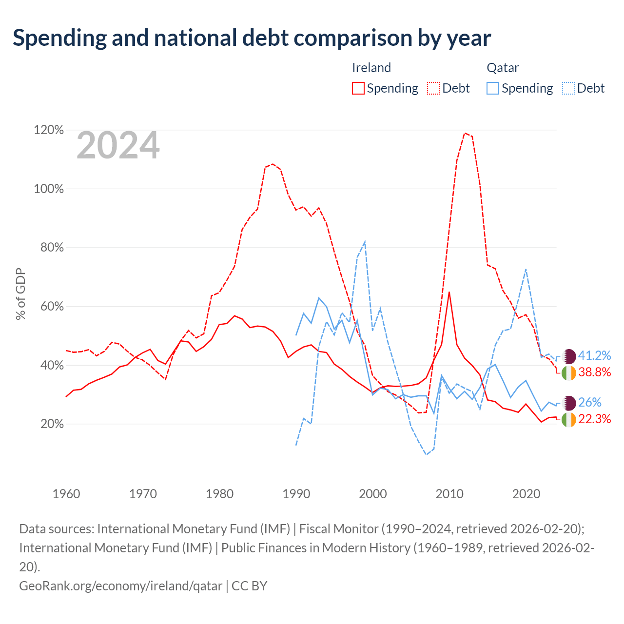 Ireland has $236B in government debt (38.8% of GDP), compared to $90.2B (41.2% of GDP) in Qatar.