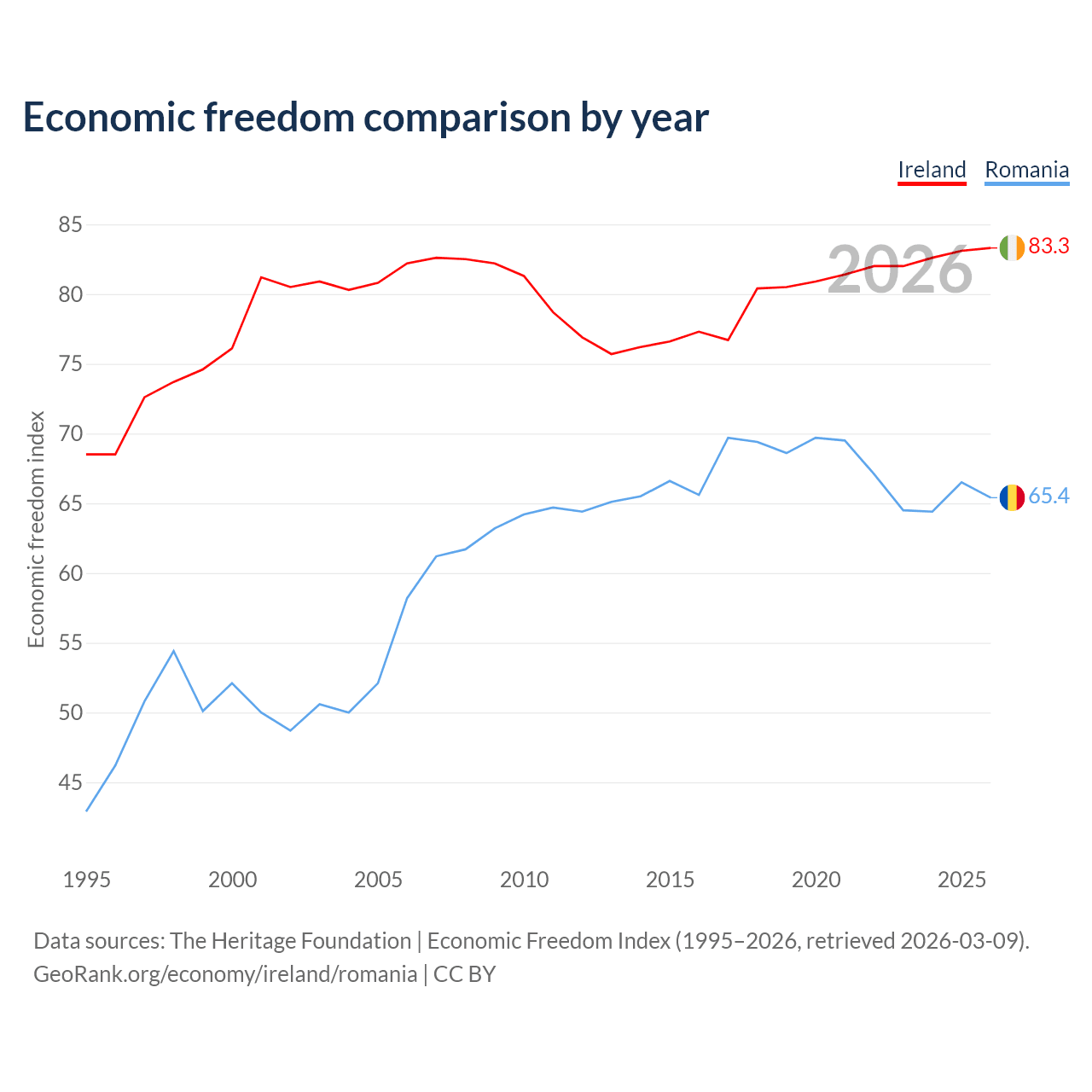 The Economic Freedom Index for Ireland is 83.3, ranking 3/197, compared to 65.4 for Romania, ranking 64/197. The chart above displays a comparison of annual changes in economic freedom indexes.