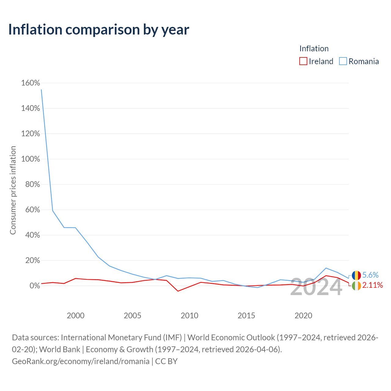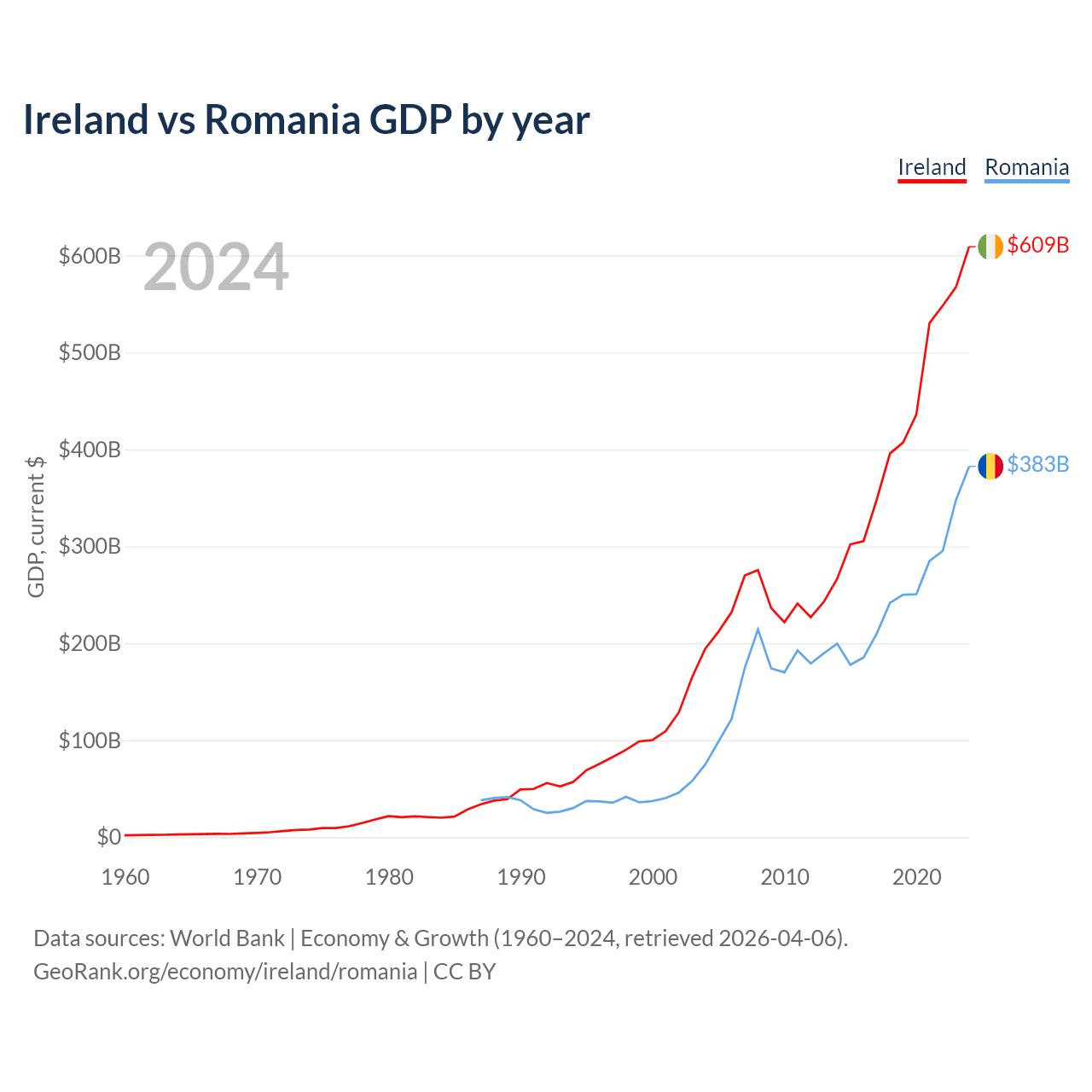 Ireland has a GDP of $609B compared to $383B for Romania, ranking 25/197 and 42/197 by economy size, respectively.