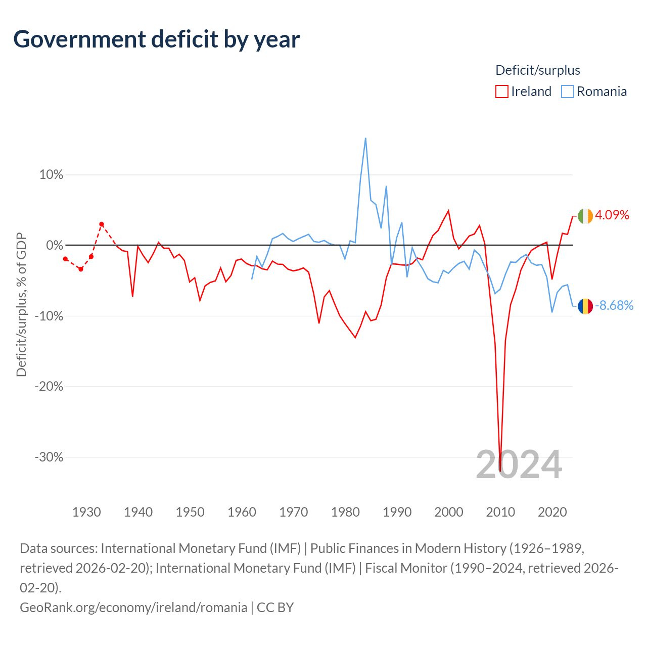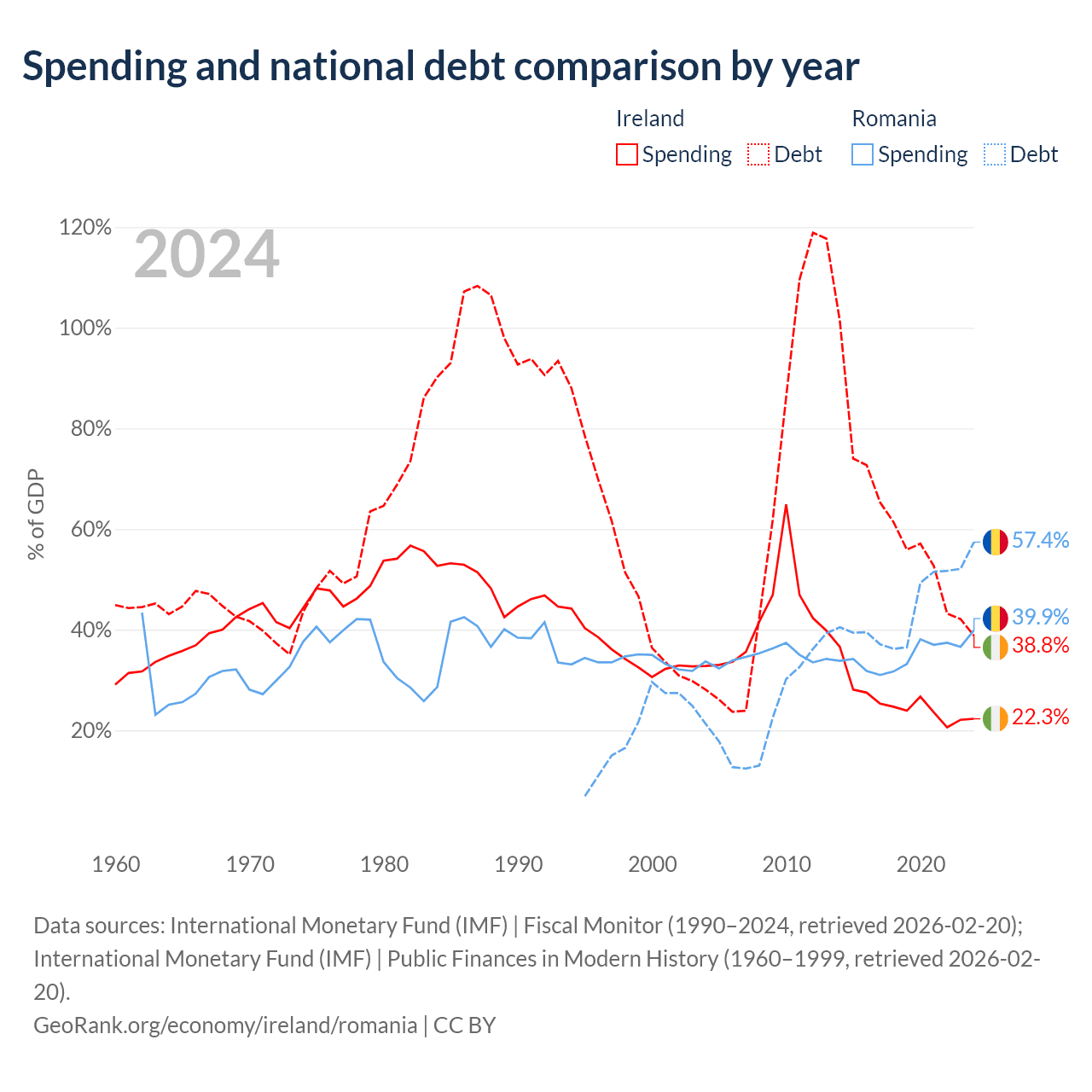 Ireland has $236B in government debt (38.8% of GDP), compared to $220B (57.4% of GDP) in Romania.