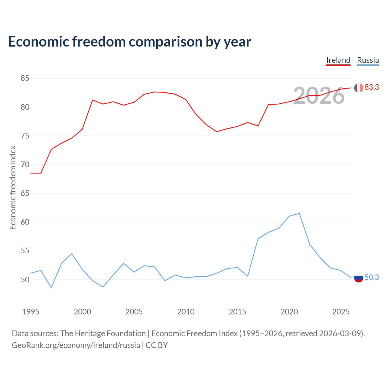 The Economic Freedom Index for Ireland is 83.3, ranking 3/197, compared to 50.3 for Russia, ranking 161/197. The chart above displays a comparison of annual changes in economic freedom indexes.