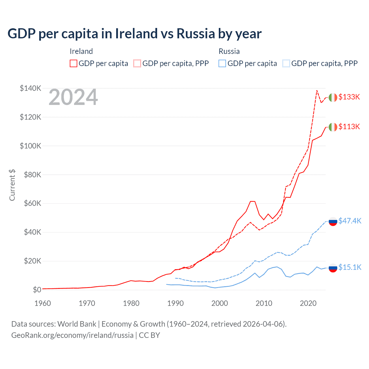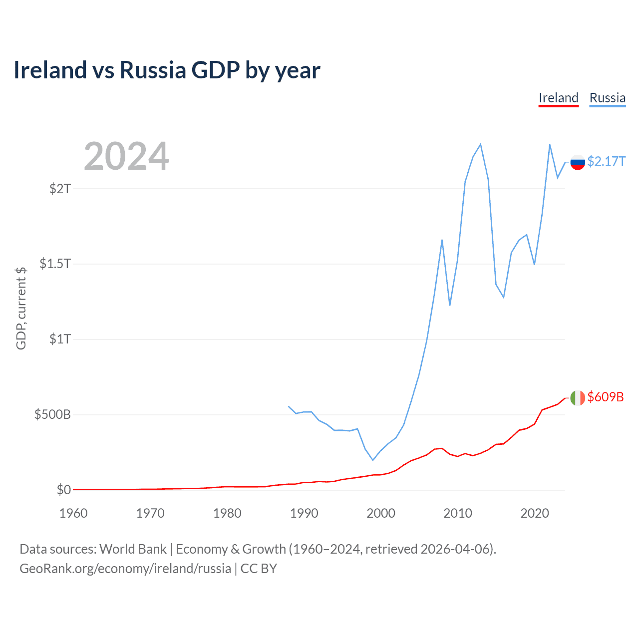 Ireland vs Russia GDP by year
