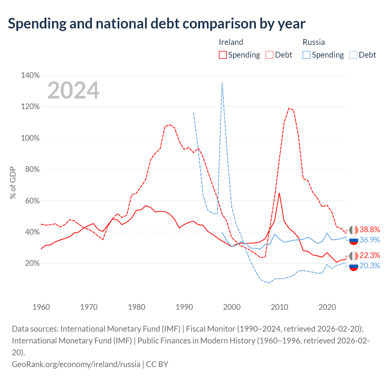 Ireland has $236B in government debt (38.8% of GDP), compared to $440B (20.3% of GDP) in Russia.