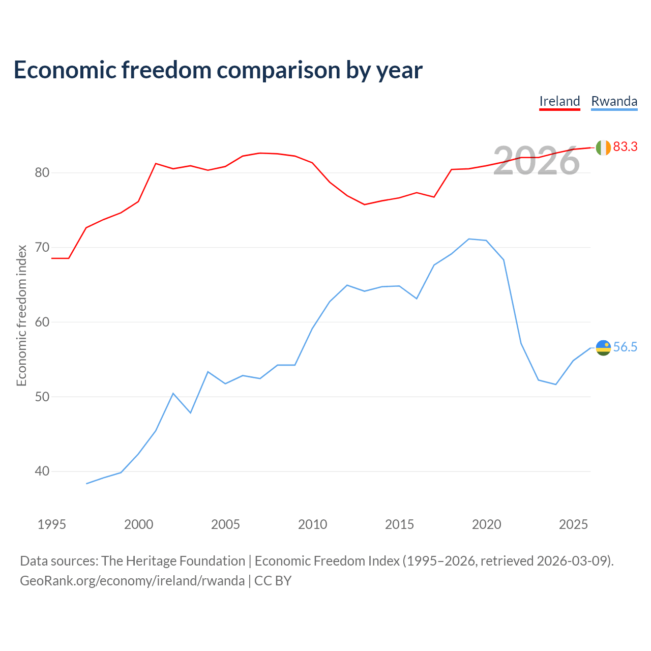 The Economic Freedom Index for Ireland is 83.3, ranking 3/197, compared to 56.5 for Rwanda, ranking 121/197. The chart above displays a comparison of annual changes in economic freedom indexes.