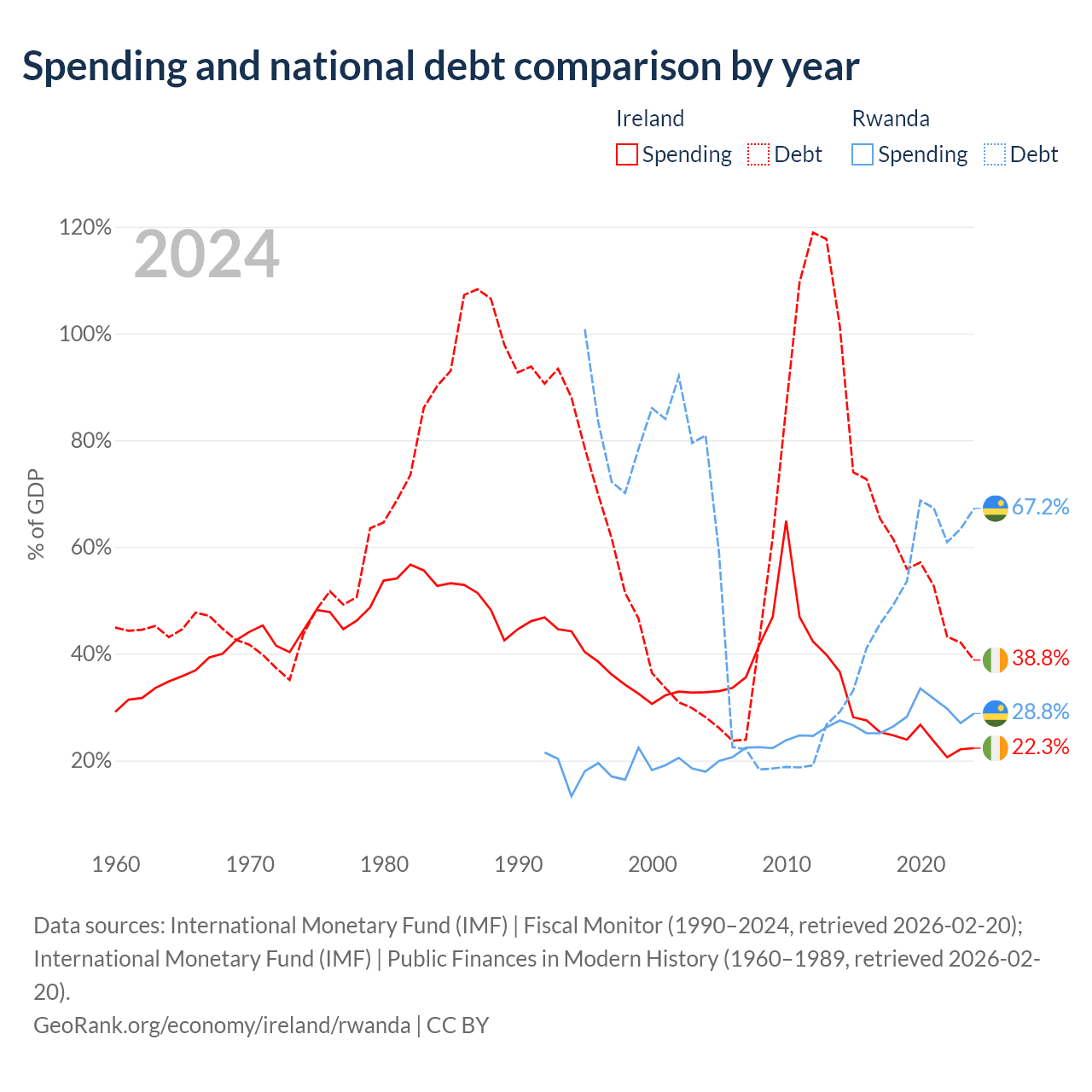 Ireland has $236B in government debt (38.8% of GDP), compared to $9.58B (67.2% of GDP) in Rwanda.
