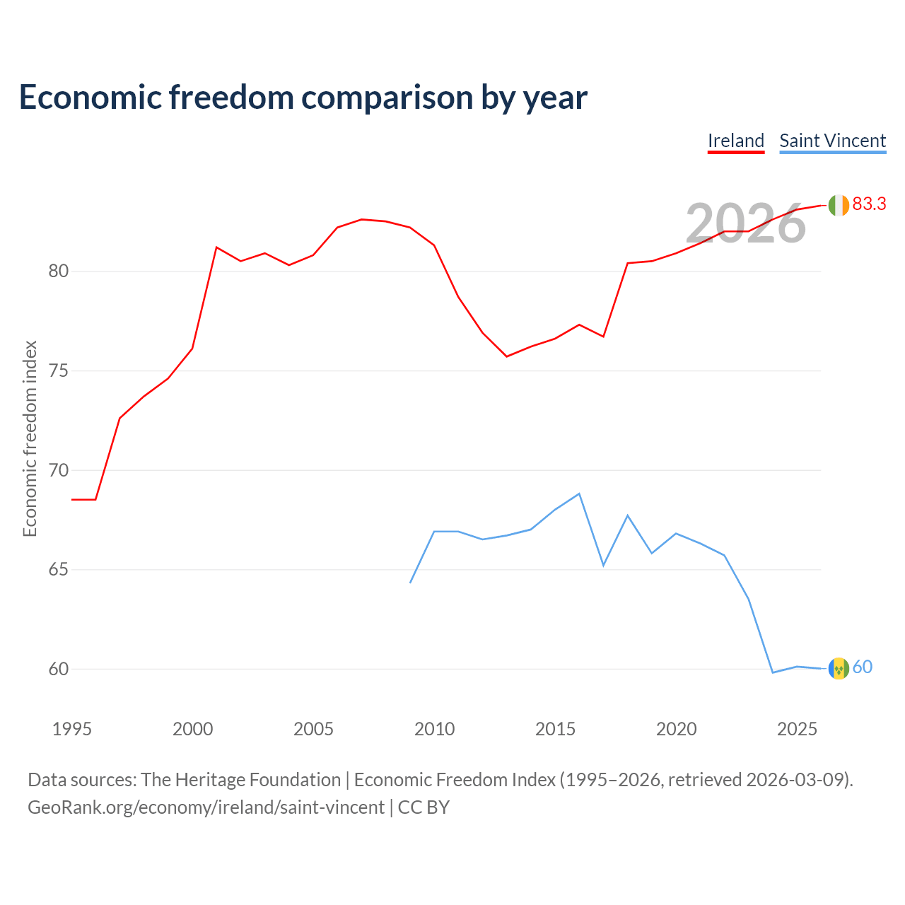 The Economic Freedom Index for Ireland is 83.3, ranking 3/197, compared to 60 for Saint Vincent, ranking 98/197. The chart above displays a comparison of annual changes in economic freedom indexes.