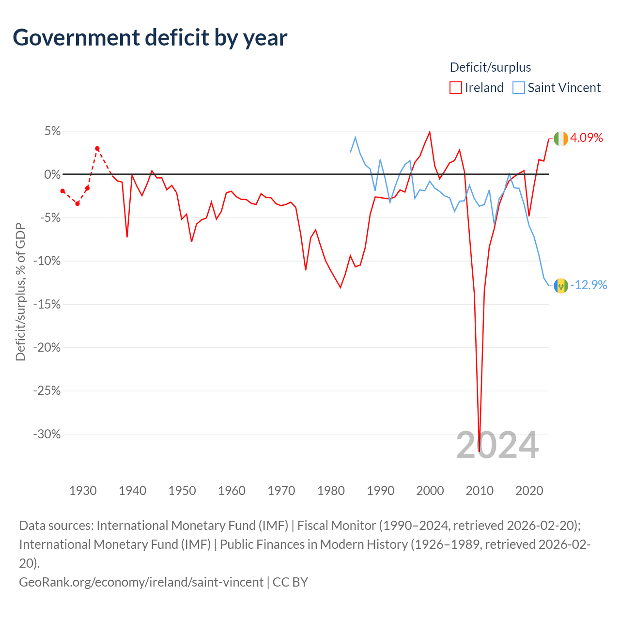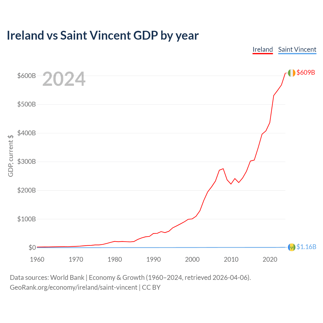 Ireland has a GDP of $609B compared to $1.16B for Saint Vincent, ranking 25/197 and 186/197 by economy size, respectively.