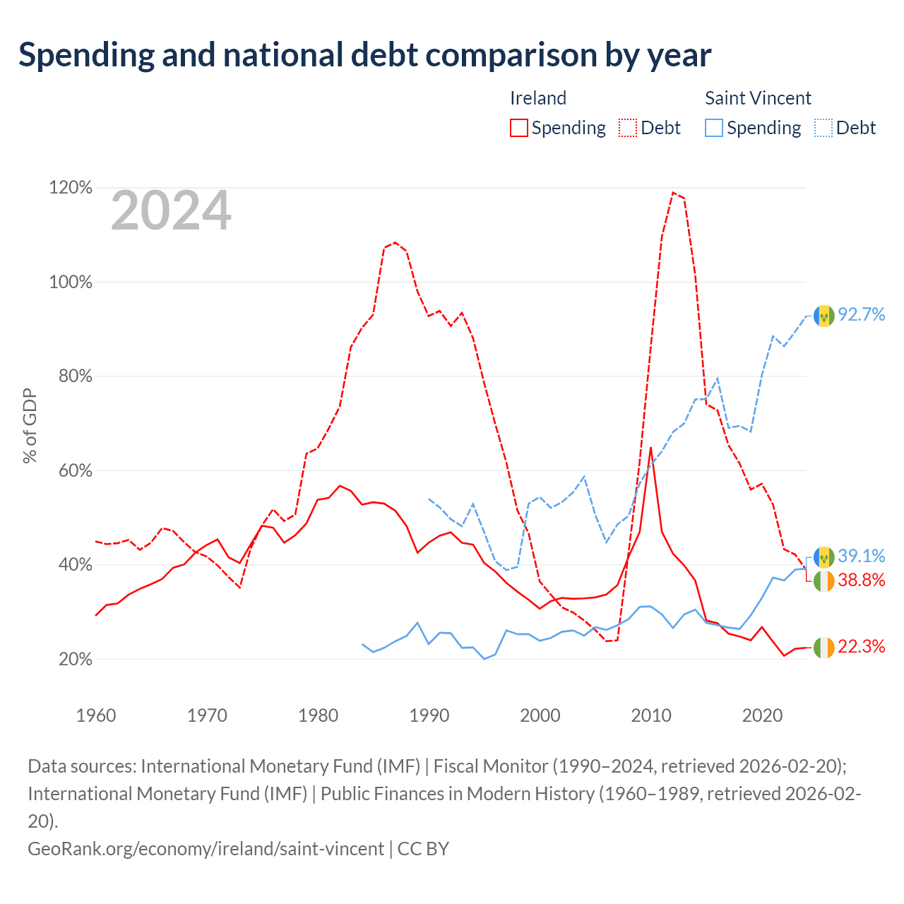 Ireland has $236B in government debt (38.8% of GDP), compared to $1.07B (92.7% of GDP) in Saint Vincent.