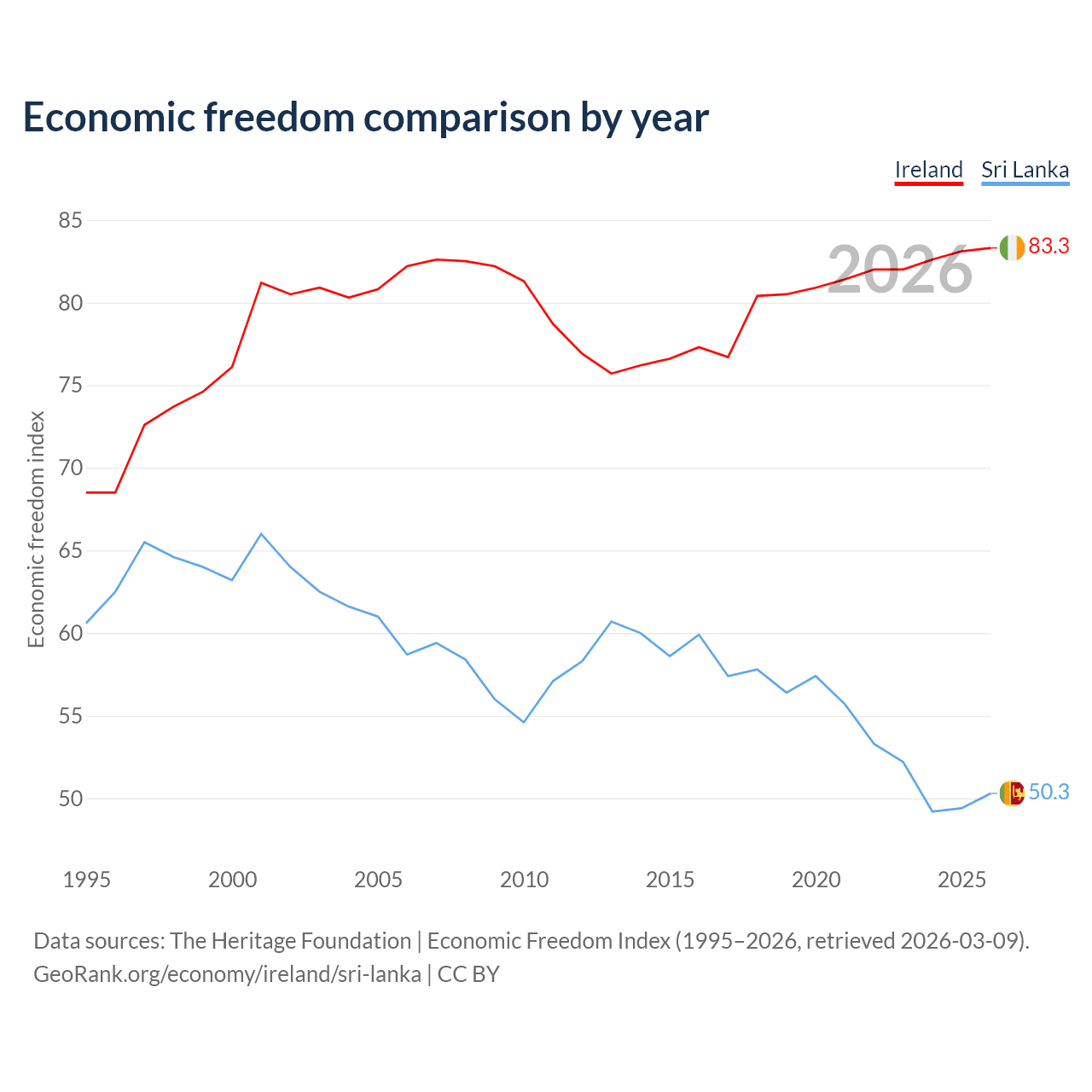 The Economic Freedom Index for Ireland is 83.3, ranking 3/197, compared to 50.3 for Sri Lanka, ranking 162/197. The chart above displays a comparison of annual changes in economic freedom indexes.