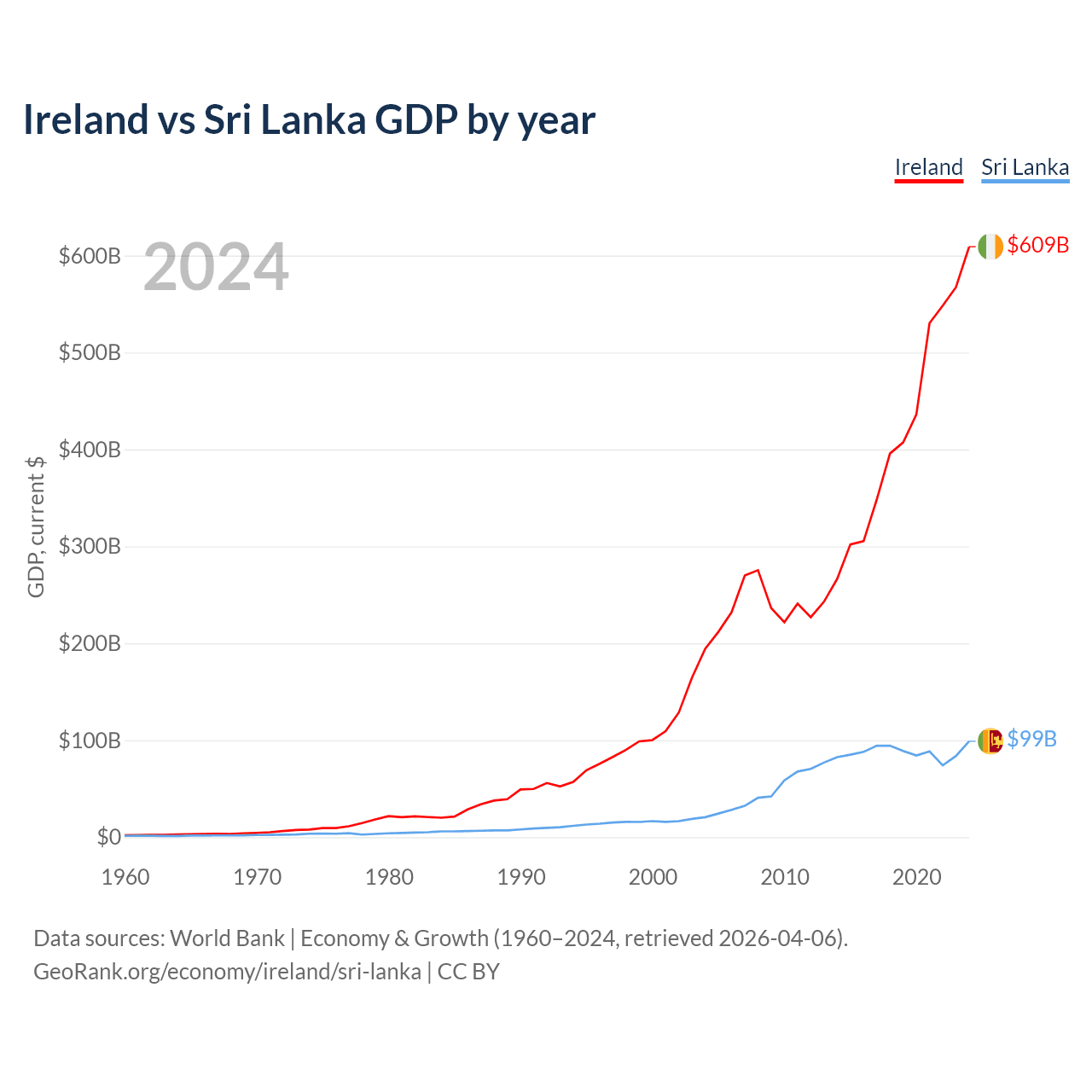 Ireland vs Sri Lanka GDP by year