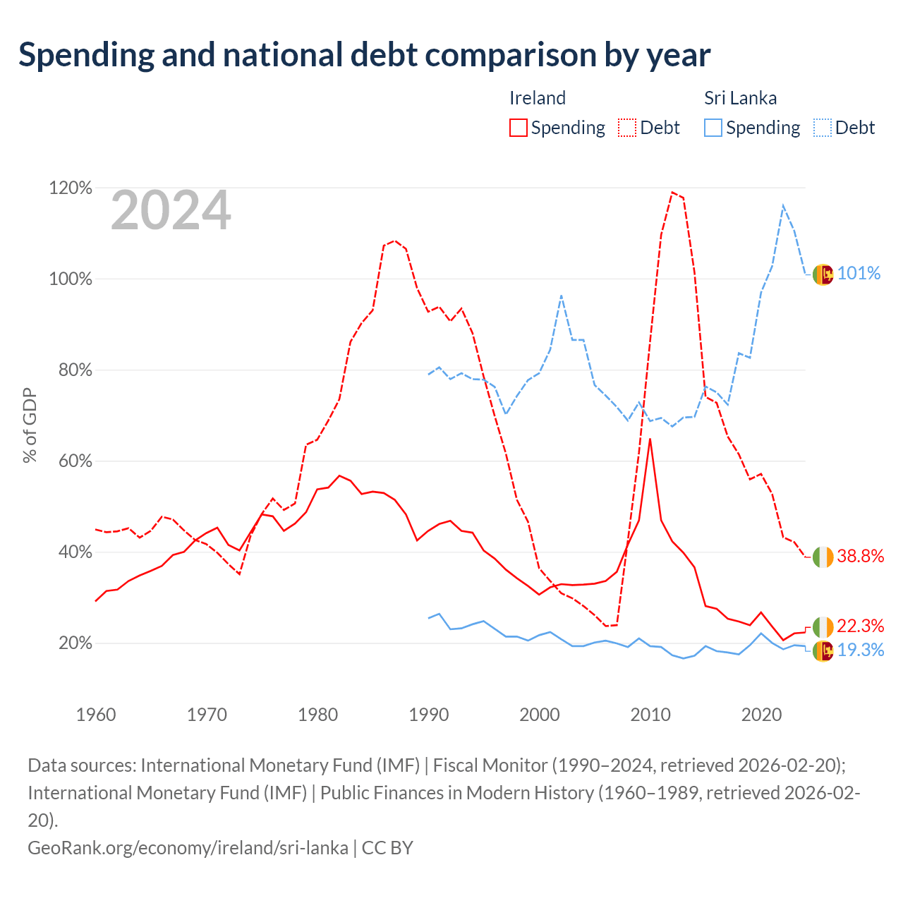 Ireland has $236B in government debt (38.8% of GDP), compared to $99.8B (100.8% of GDP) in Sri Lanka.