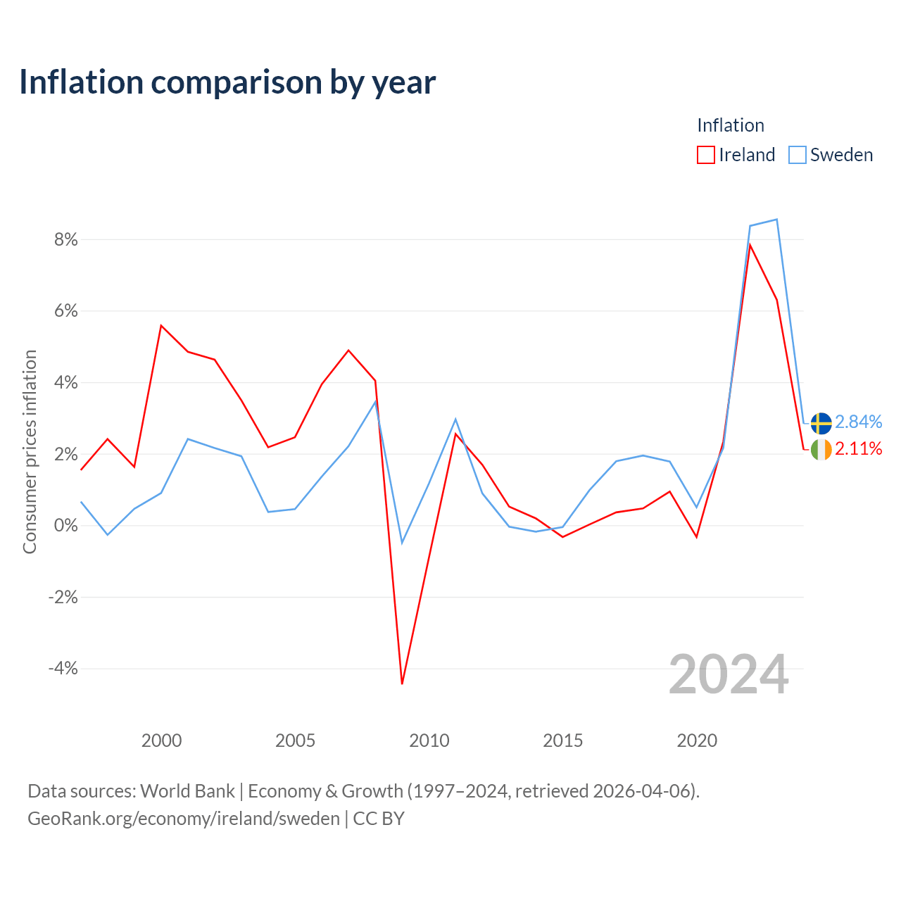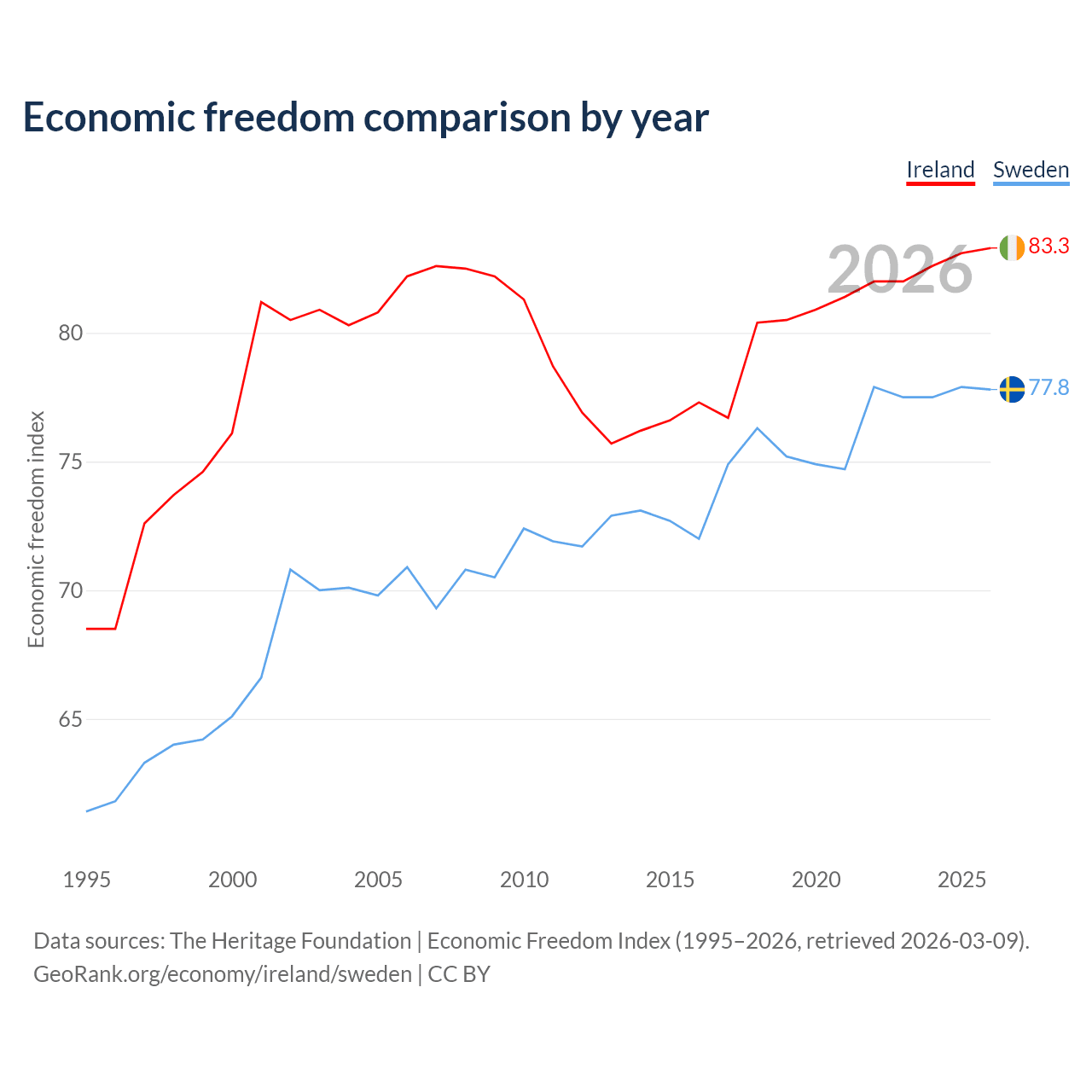 The Economic Freedom Index for Ireland is 83.3, ranking 3/197, compared to 77.8 for Sweden, ranking 14/197. The chart above displays a comparison of annual changes in economic freedom indexes.