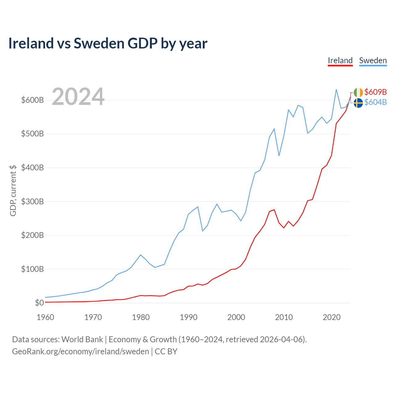 Ireland has a GDP of $609B compared to $604B for Sweden, ranking 25/197 and 26/197 by economy size, respectively.