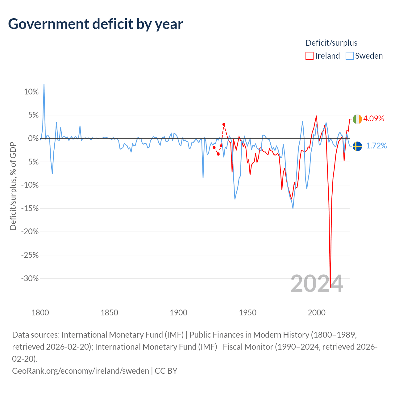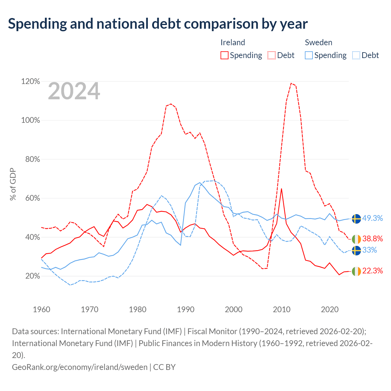 Ireland has $236B in government debt (38.8% of GDP), compared to $199B (33% of GDP) in Sweden.
