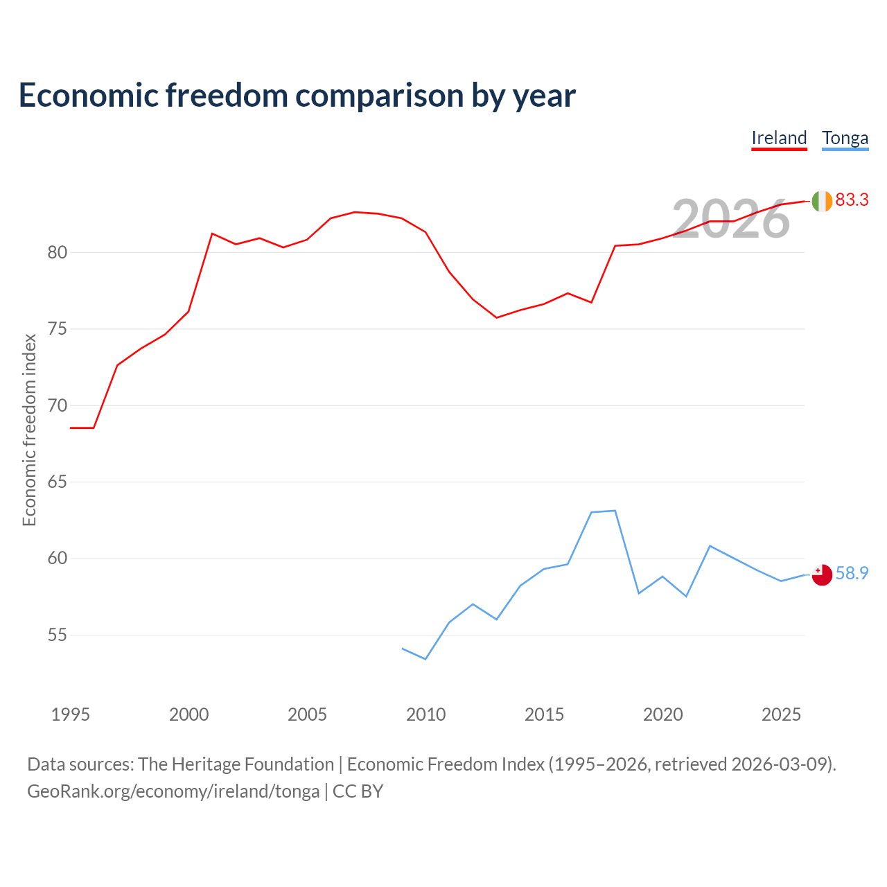 The Economic Freedom Index for Ireland is 83.3, ranking 3/197, compared to 58.9 for Tonga, ranking 107/197. The chart above displays a comparison of annual changes in economic freedom indexes.