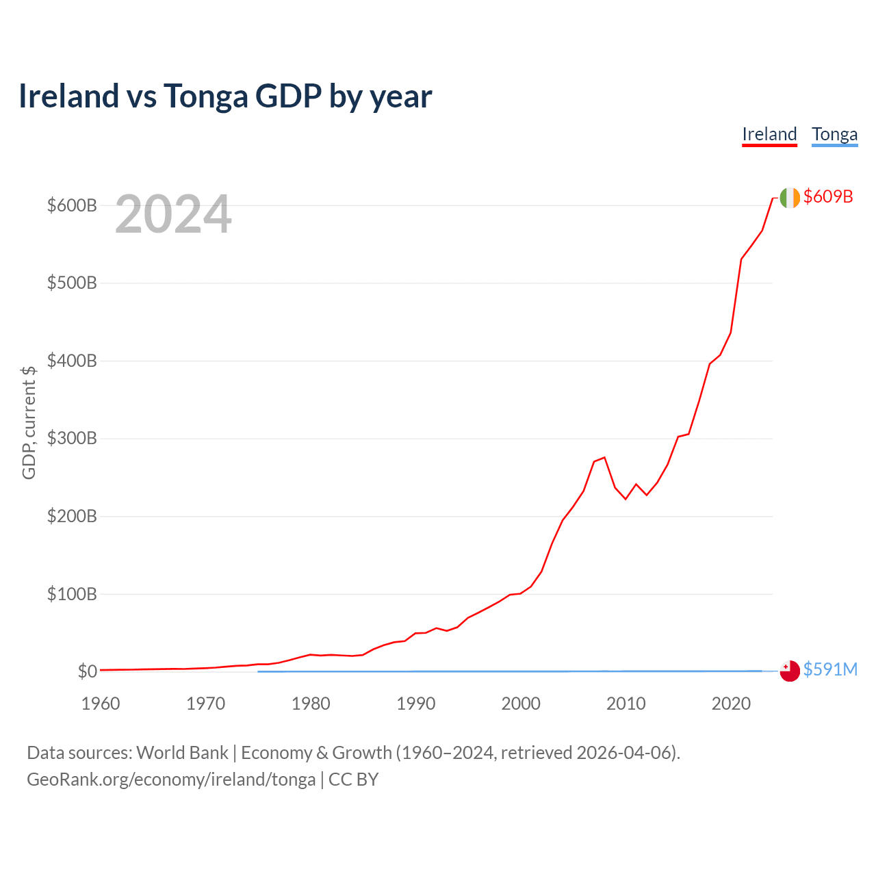 Ireland has a GDP of $609B compared to $591M for Tonga, ranking 25/197 and 191/197 by economy size, respectively.