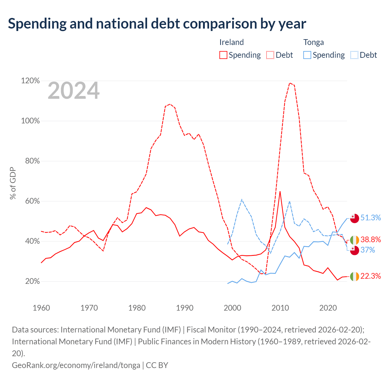 Ireland has $236B in government debt (38.8% of GDP), compared to $256M (37% of GDP) in Tonga.