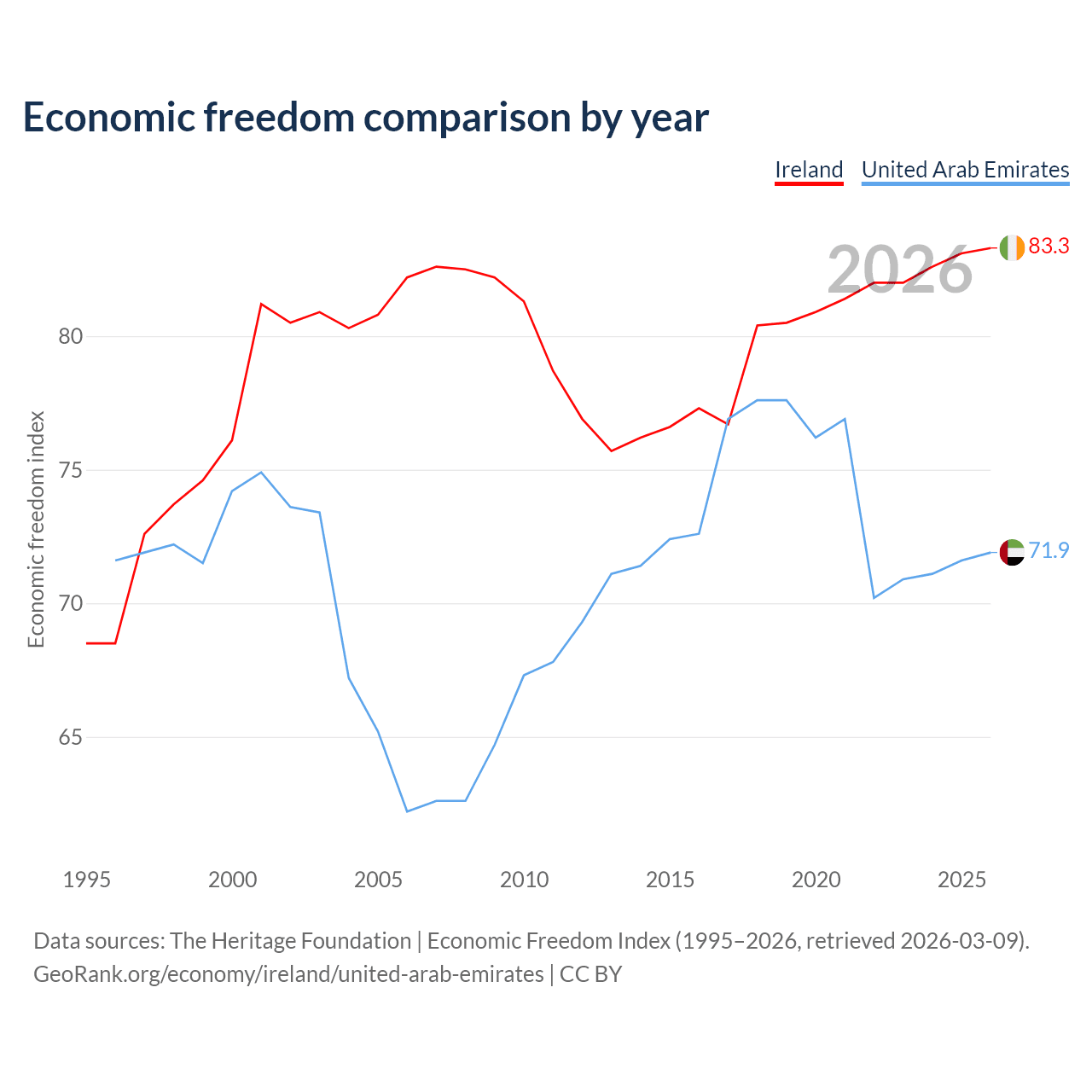 The Economic Freedom Index for Ireland is 83.3, ranking 3/197, compared to 71.9 for the United Arab Emirates, ranking 29/197. The chart above displays a comparison of annual changes in economic freedom indexes.