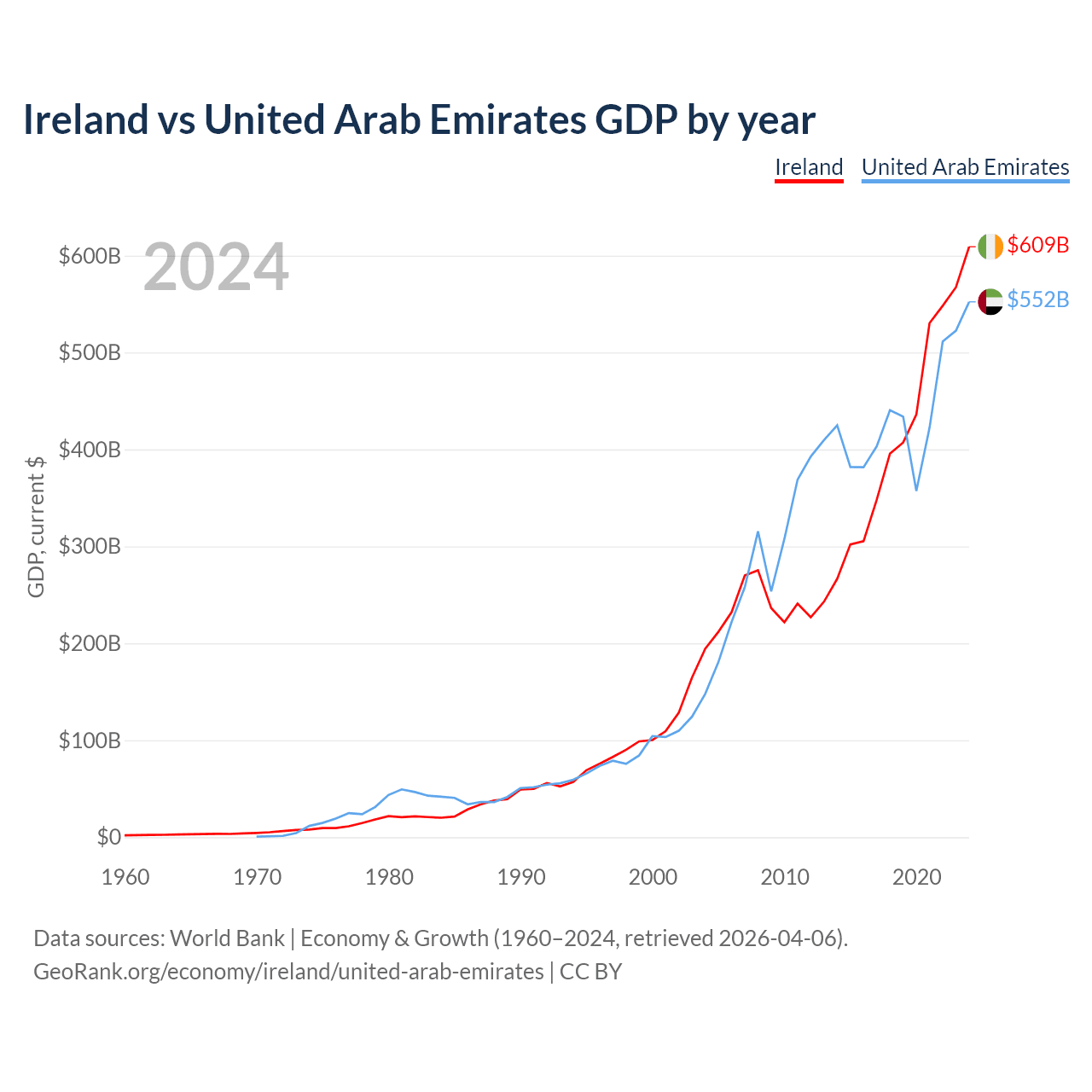 Ireland has a GDP of $609B compared to $552B for the United Arab Emirates, ranking 25/197 and 27/197 by economy size, respectively.