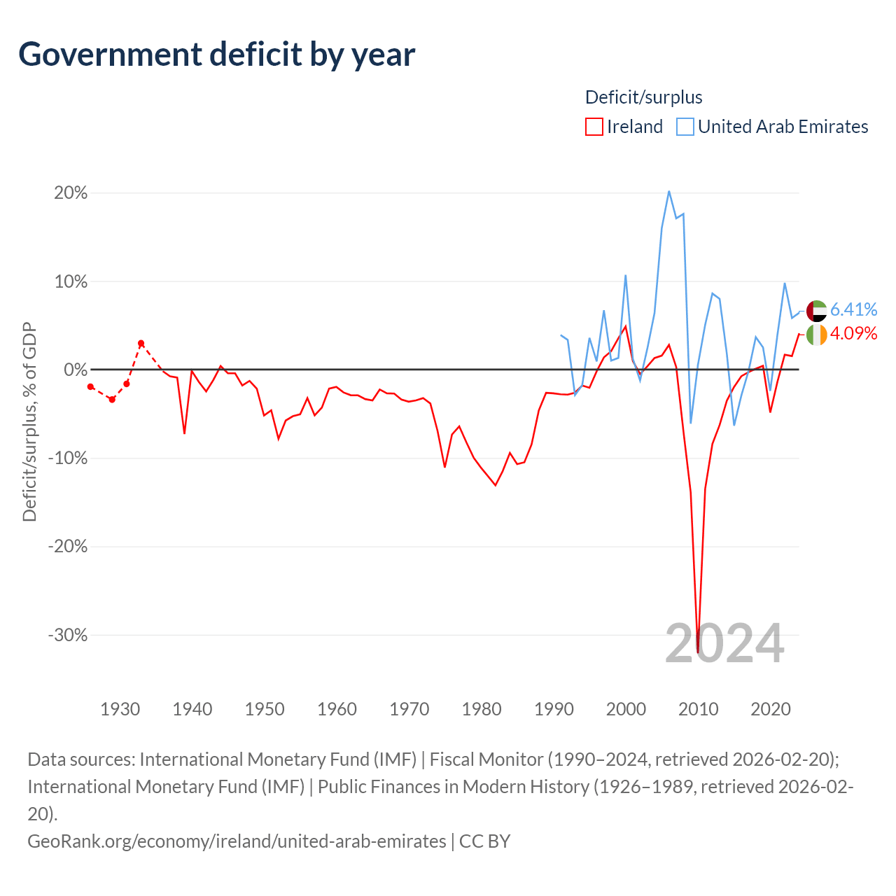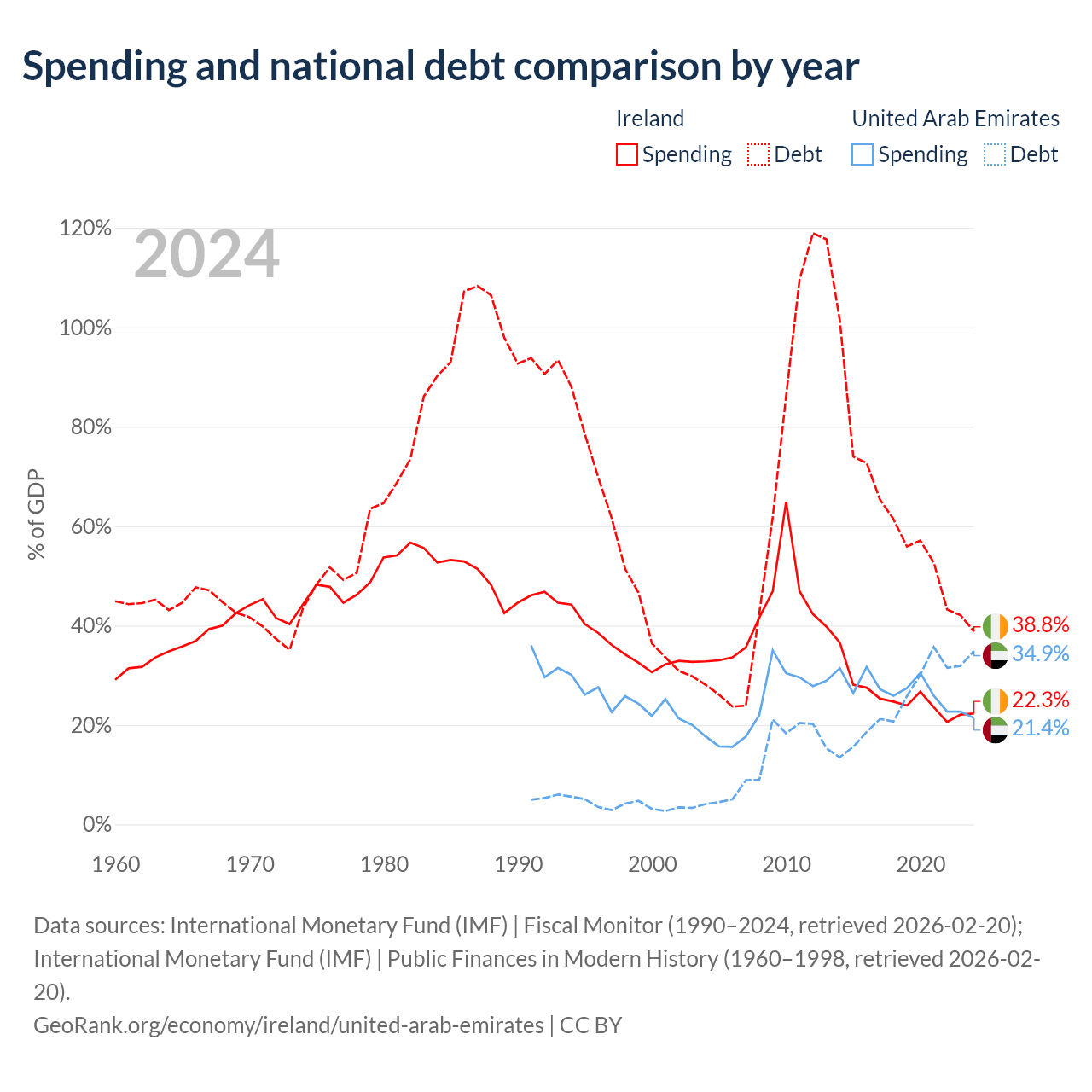 Ireland has $236B in government debt (38.8% of GDP), compared to $193B (34.9% of GDP) in the United Arab Emirates.