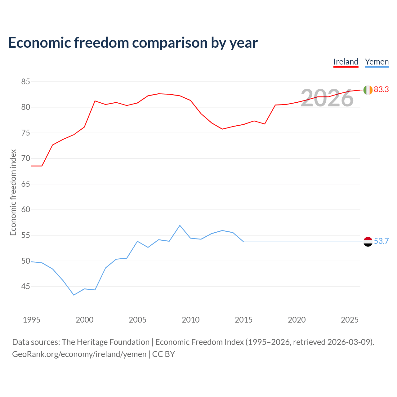 The Economic Freedom Index for Ireland is 83.3, ranking 3/197, compared to 53.7 for Yemen, ranking 138/197. The chart above displays a comparison of annual changes in economic freedom indexes.