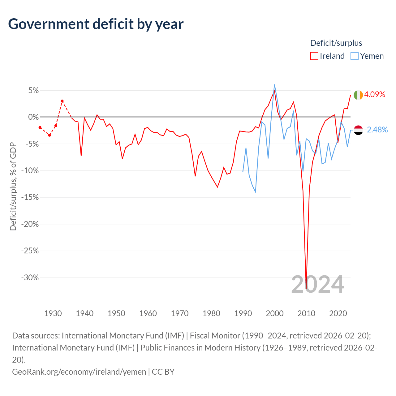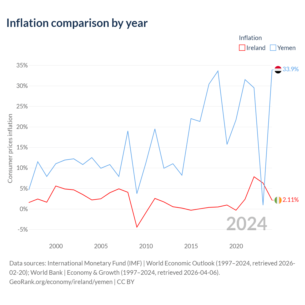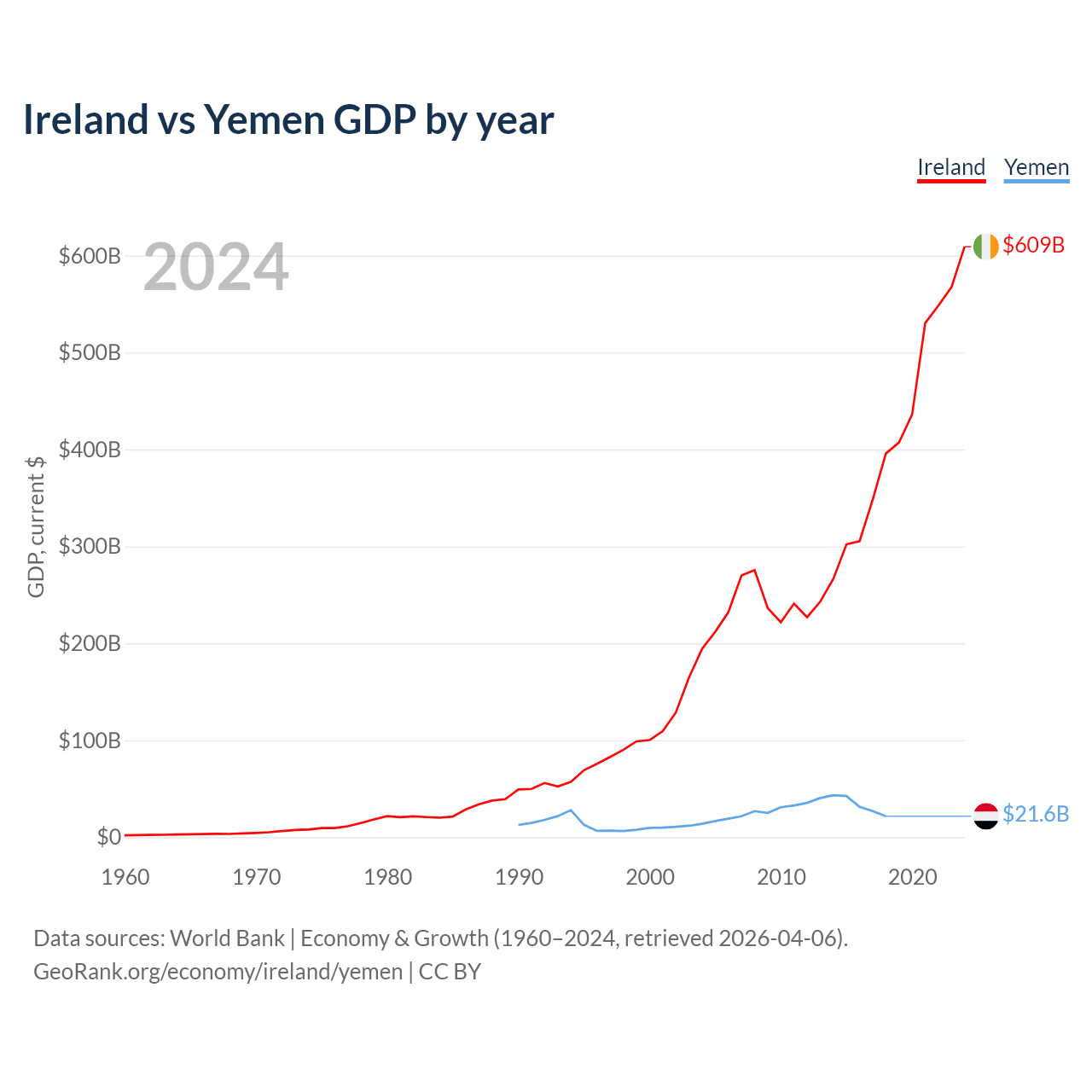 Ireland has a GDP of $609B compared to $21.6B for Yemen, ranking 25/197 and 125/197 by economy size, respectively.