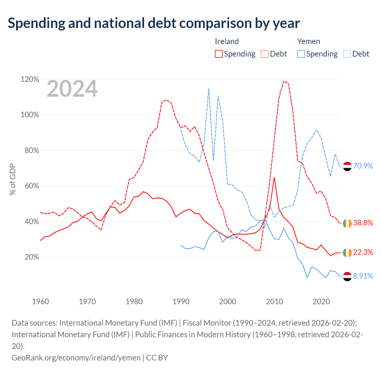 Ireland has $236B in government debt (38.8% of GDP), compared to $18.8B (70.9% of GDP) in Yemen.
