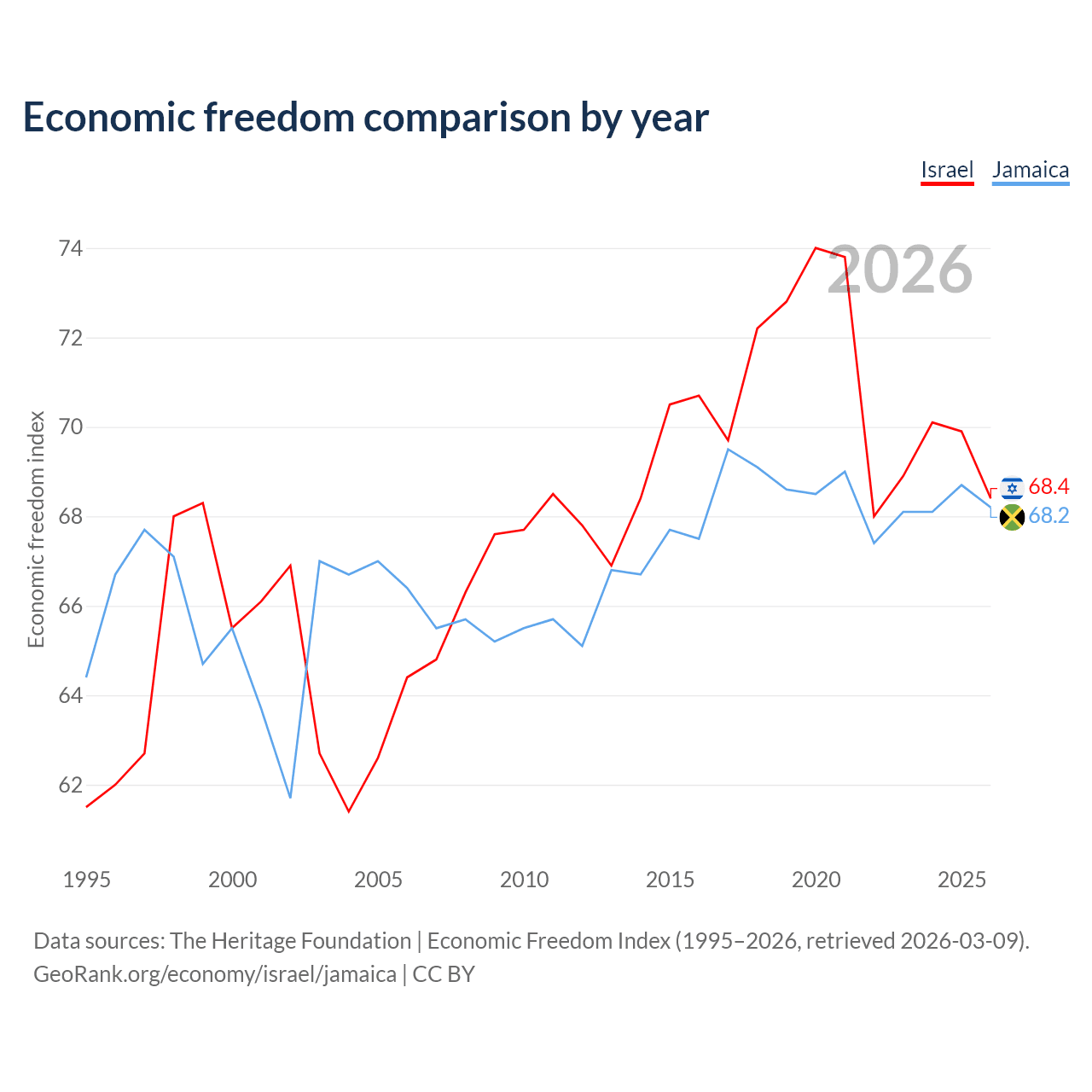 The Economic Freedom Index for Israel is 68.4, ranking 47/197, compared to 68.2 for Jamaica, ranking 48/197. The chart above displays a comparison of annual changes in economic freedom indexes.