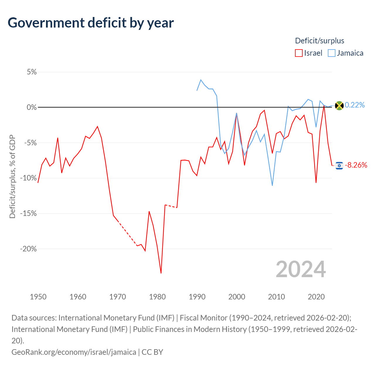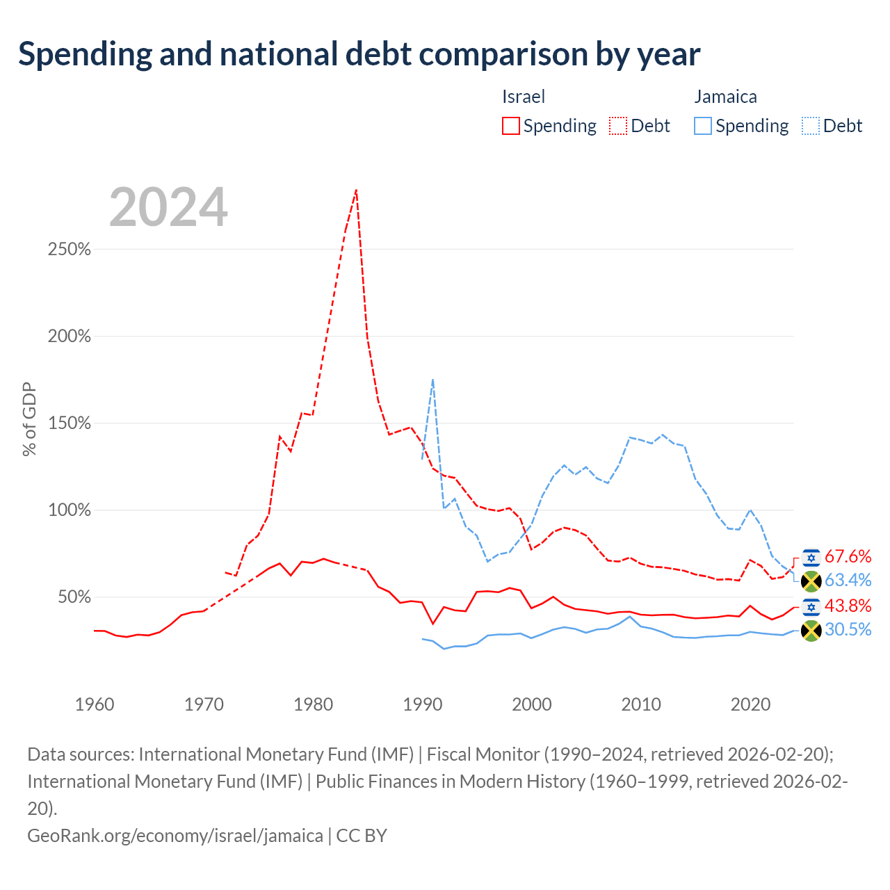 Israel has $366B in government debt (67.6% of GDP), compared to $14B (63.4% of GDP) in Jamaica.
