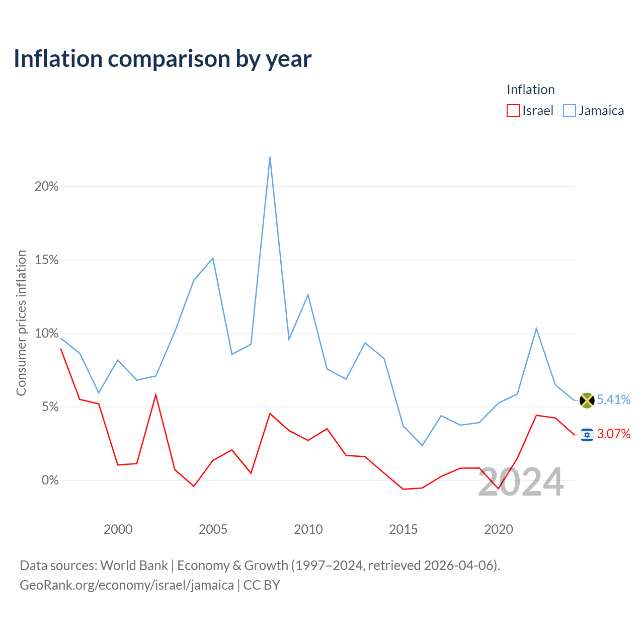 Israel has a GDP of $540B compared to $22B for Jamaica, ranking 29/197 and 124/197 by economy size, respectively.