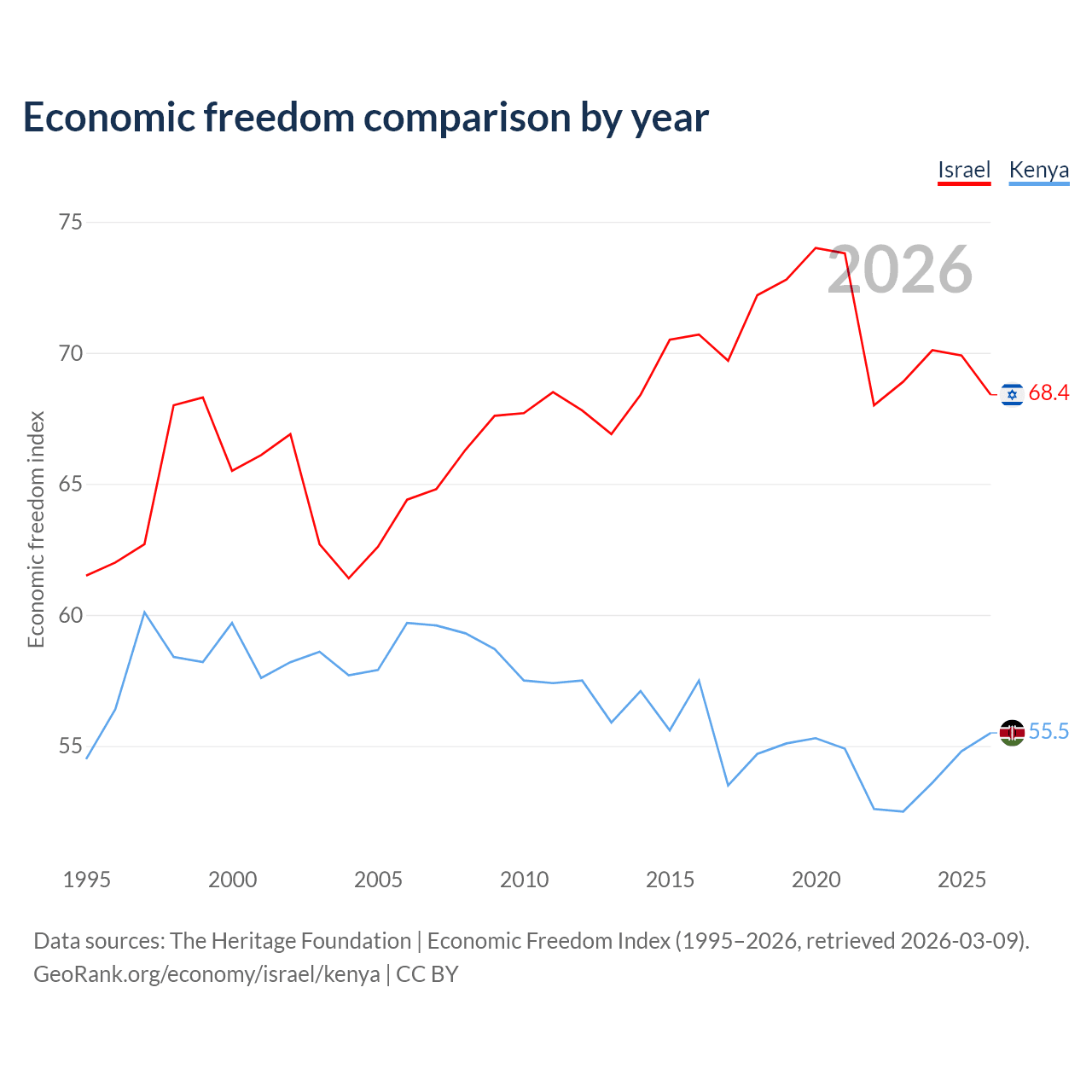 The Economic Freedom Index for Israel is 68.4, ranking 47/197, compared to 55.5 for Kenya, ranking 128/197. The chart above displays a comparison of annual changes in economic freedom indexes.