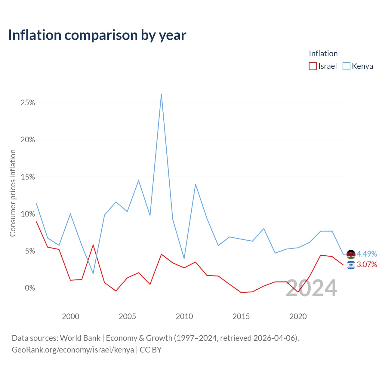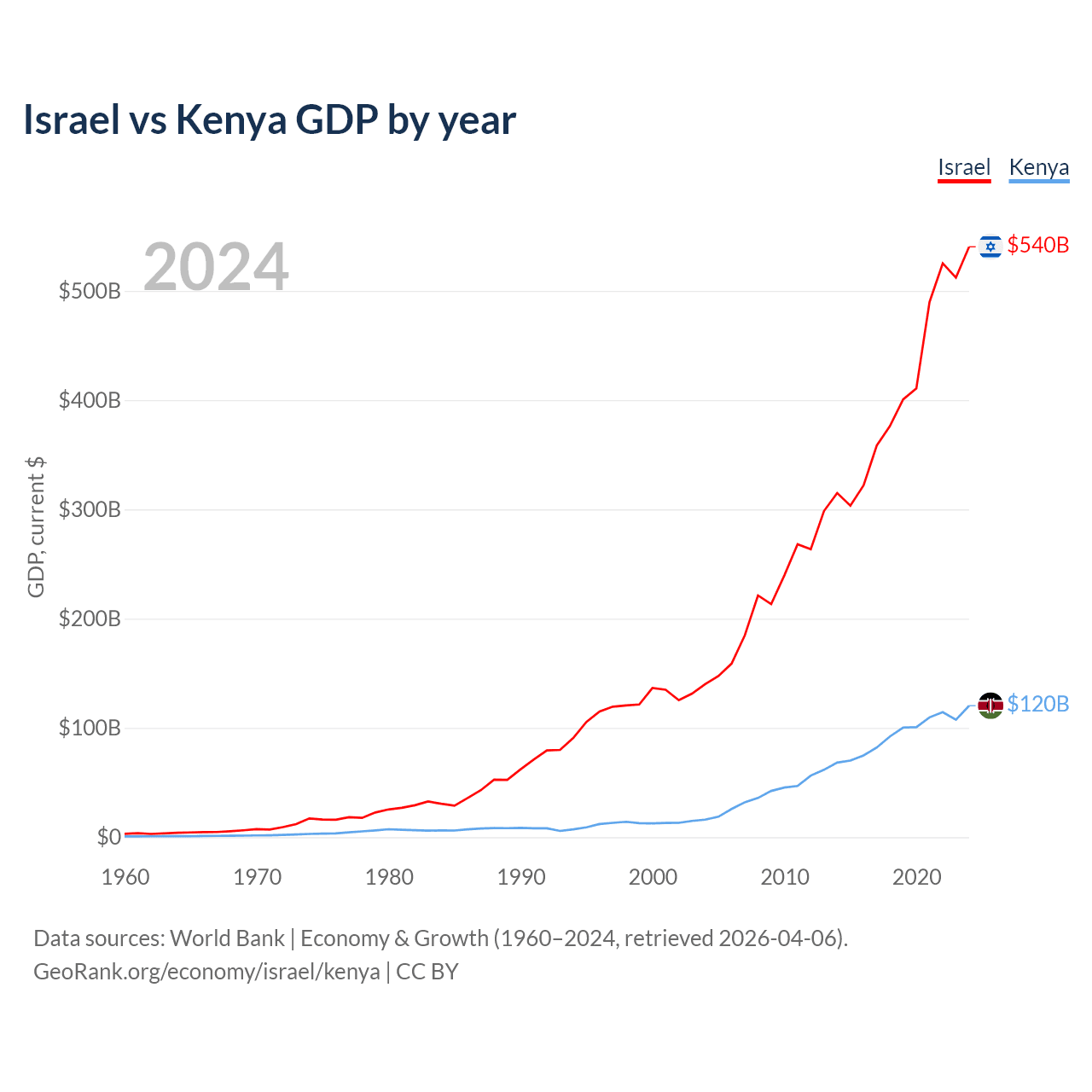 Israel has a GDP of $540B compared to $120B for Kenya, ranking 29/197 and 64/197 by economy size, respectively.
