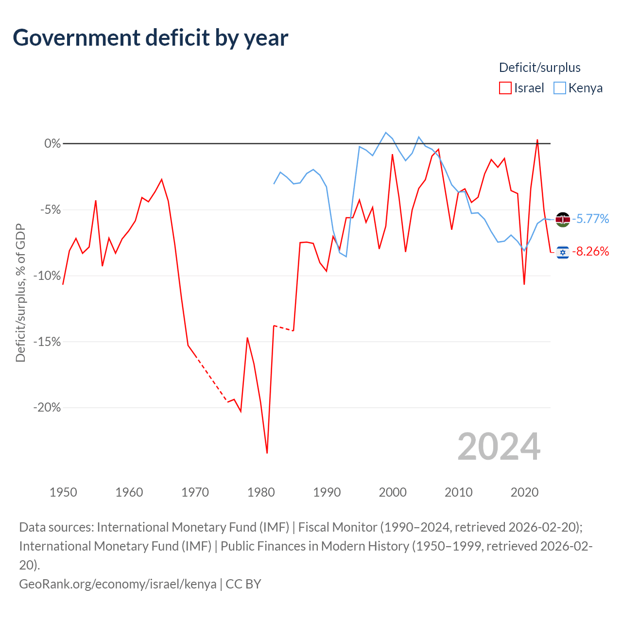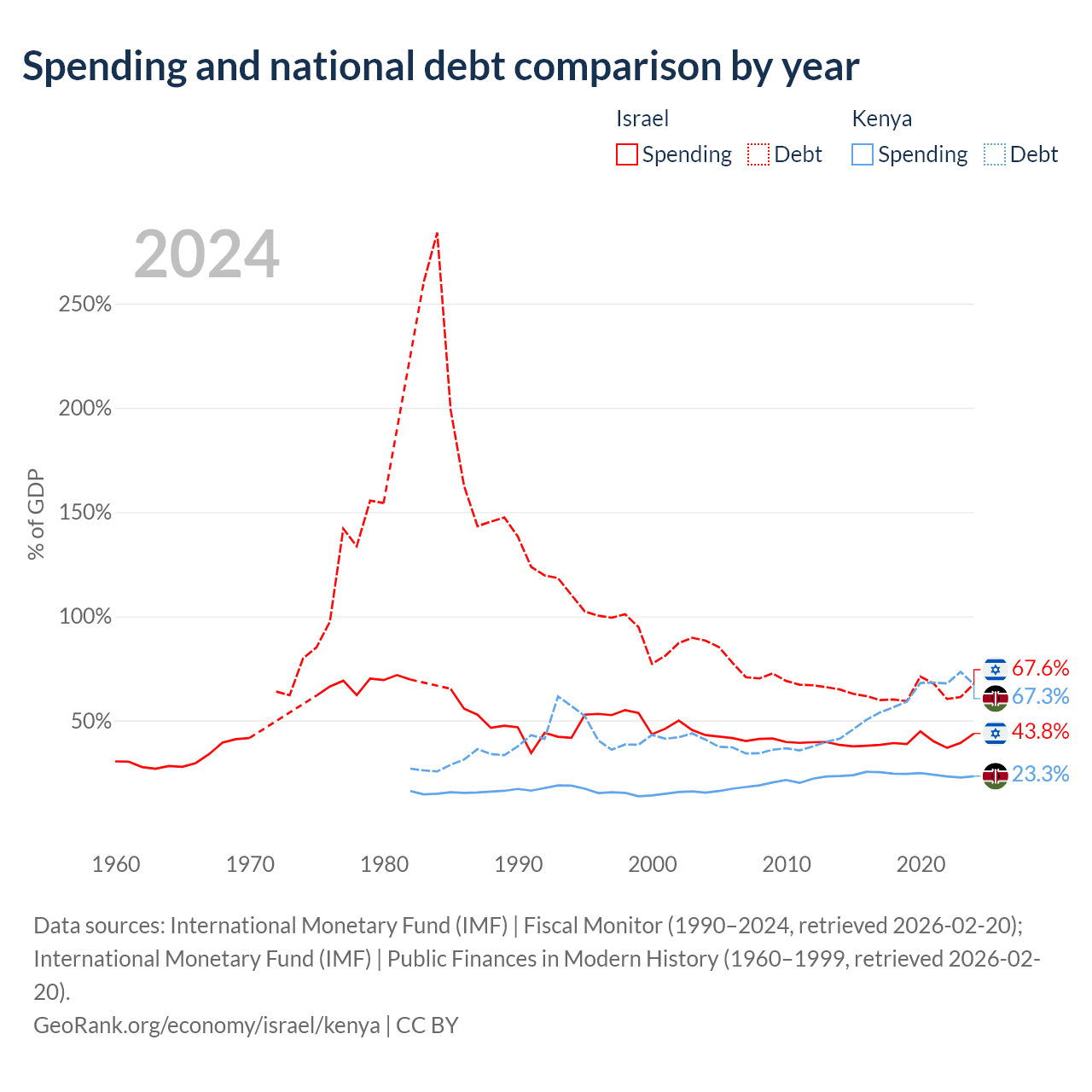 Israel has $366B in government debt (67.6% of GDP), compared to $81B (67.3% of GDP) in Kenya.