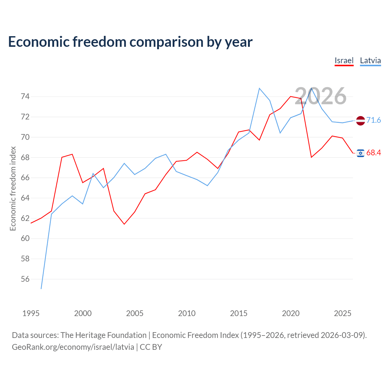 The Economic Freedom Index for Israel is 68.4, ranking 47/197, compared to 71.6 for Latvia, ranking 31/197. The chart above displays a comparison of annual changes in economic freedom indexes.