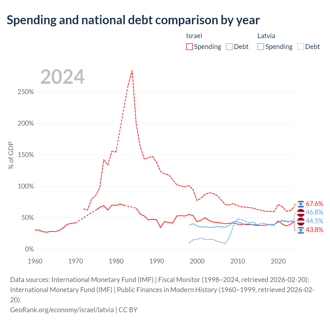 Israel has $366B in government debt (67.6% of GDP), compared to $20.4B (46.8% of GDP) in Latvia.