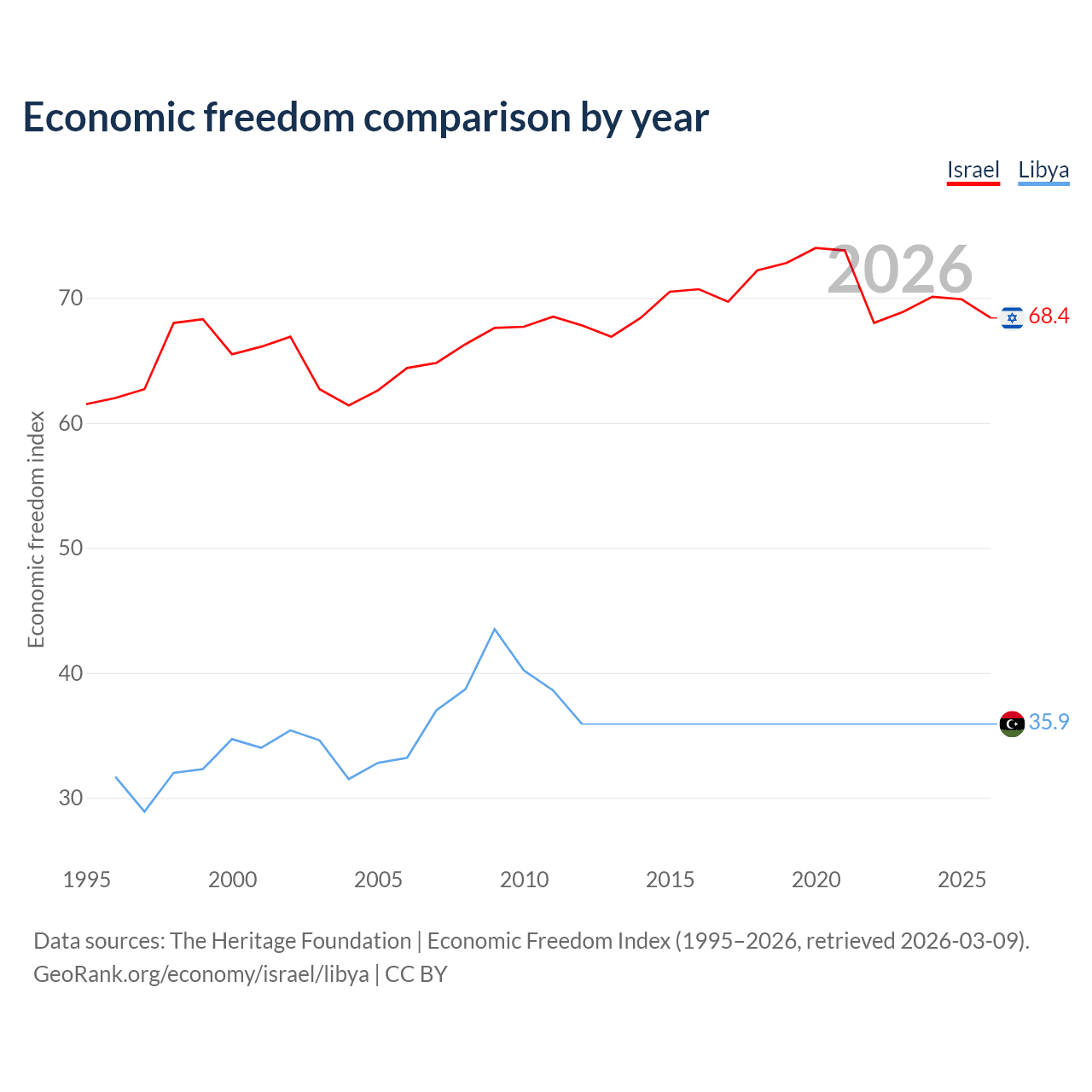 The Economic Freedom Index for Israel is 68.4, ranking 47/197, compared to 35.9 for Libya, ranking 189/197. The chart above displays a comparison of annual changes in economic freedom indexes.