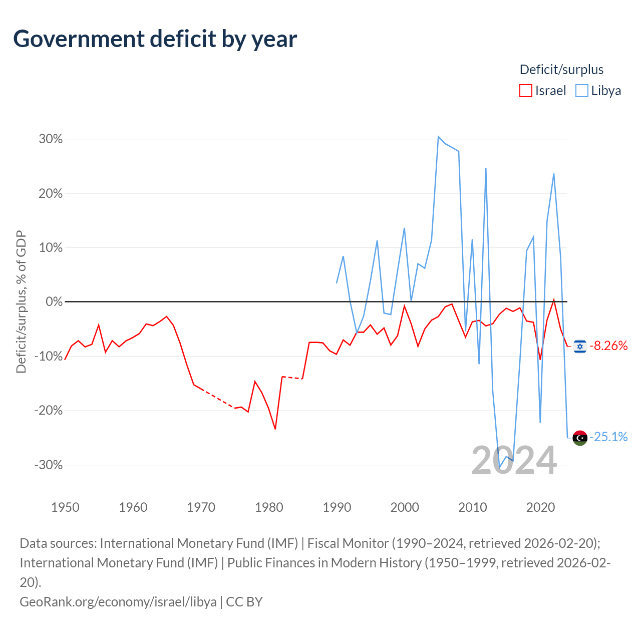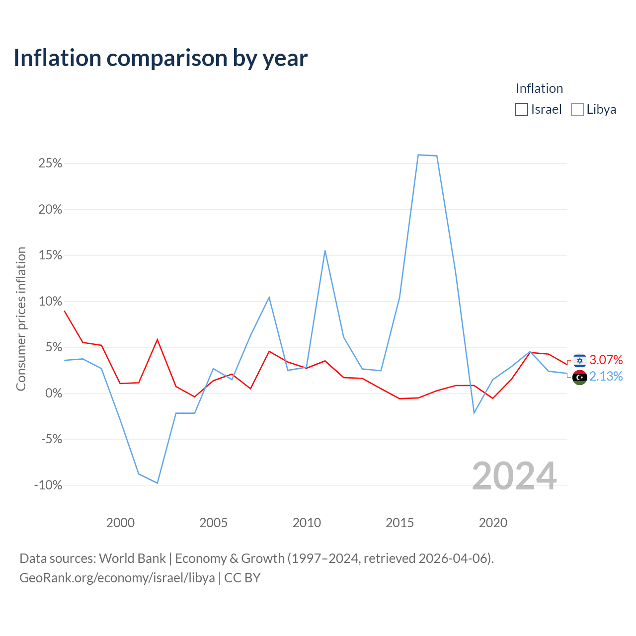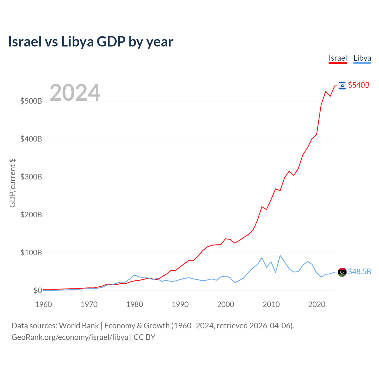 Israel has a GDP of $540B compared to $48.5B for Libya, ranking 29/197 and 95/197 by economy size, respectively.
