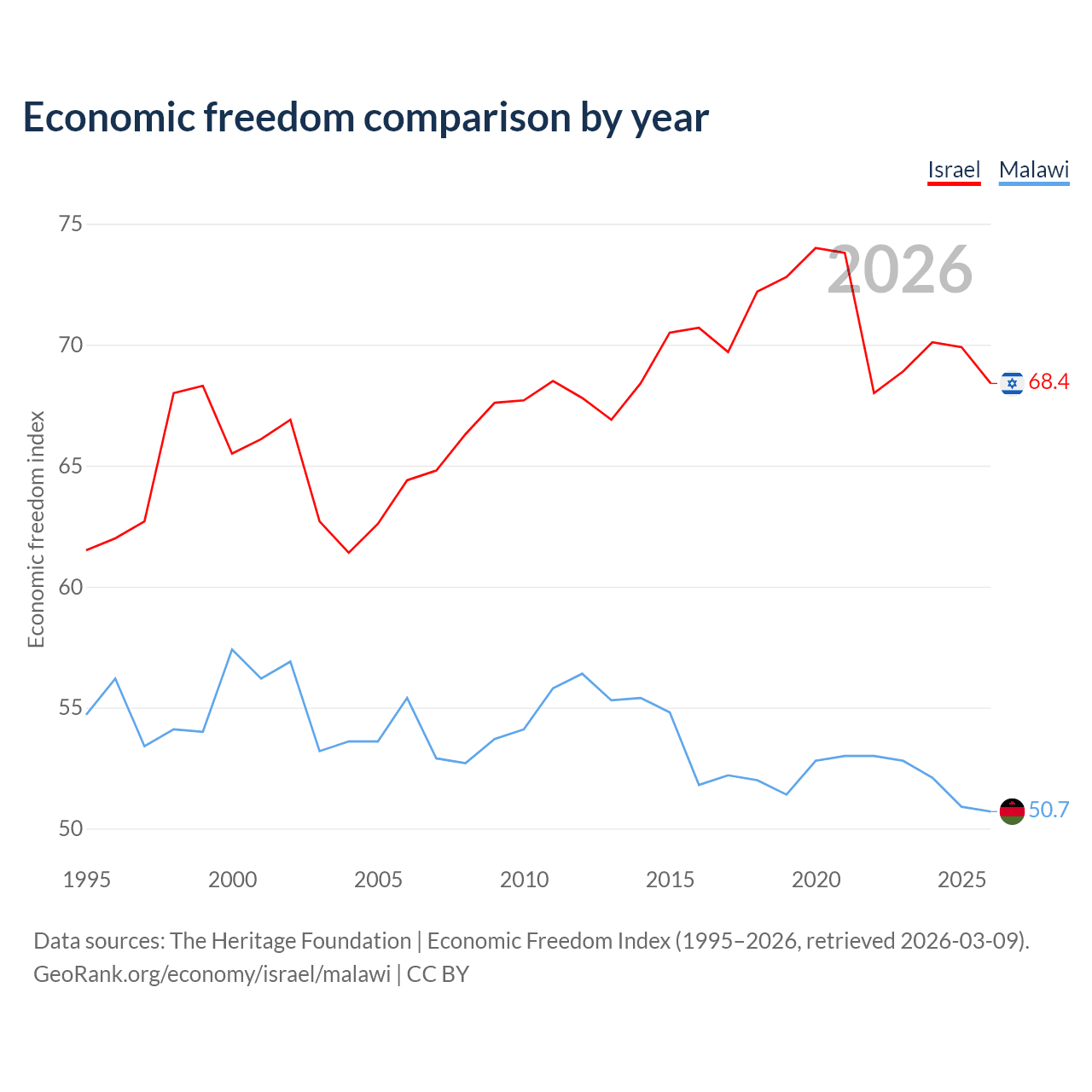 The Economic Freedom Index for Israel is 68.4, ranking 47/197, compared to 50.7 for Malawi, ranking 159/197. The chart above displays a comparison of annual changes in economic freedom indexes.