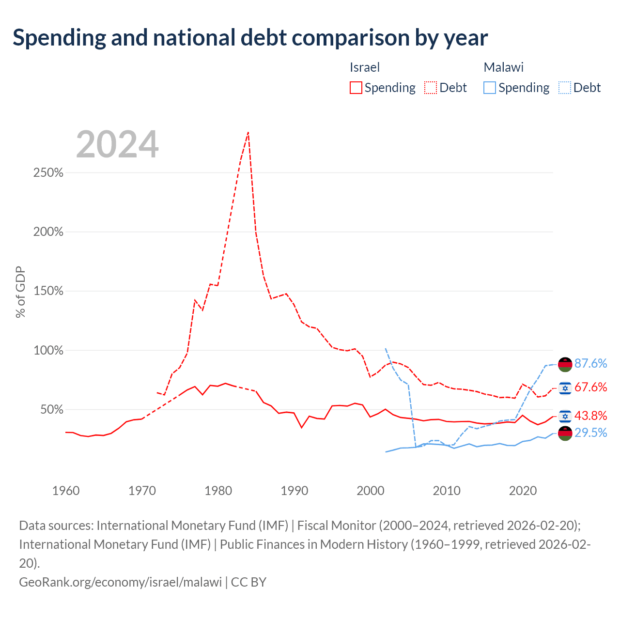 Israel has $366B in government debt (67.6% of GDP), compared to $9.91B (87.6% of GDP) in Malawi.