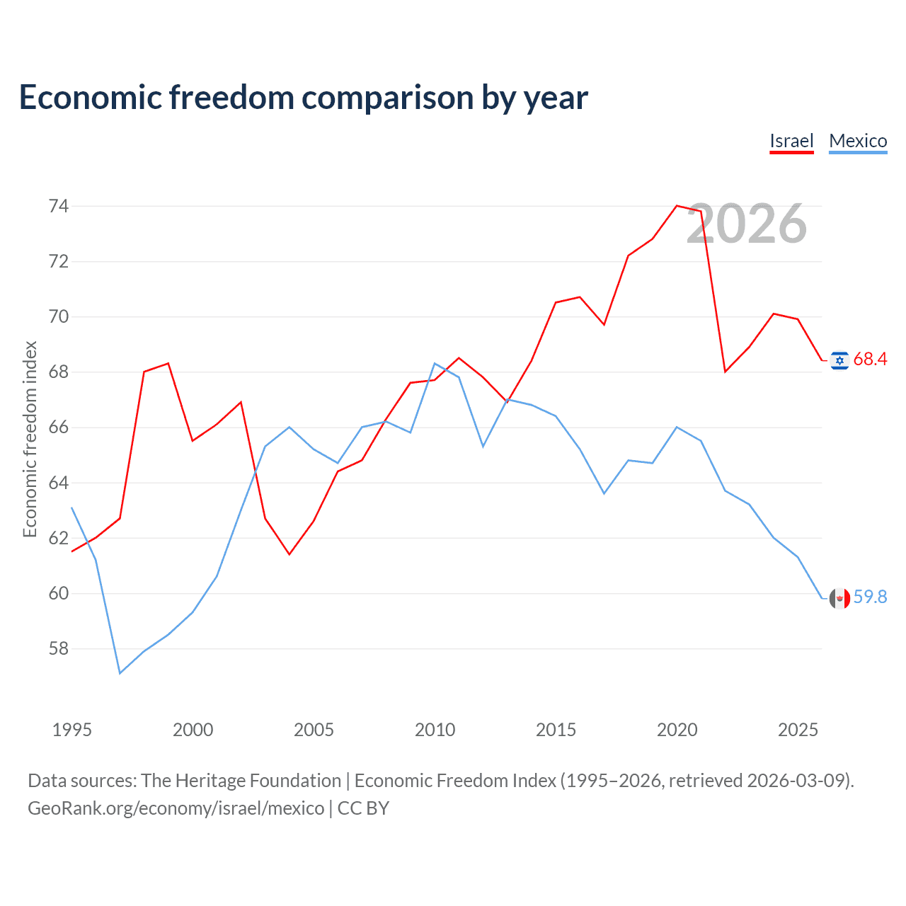 The Economic Freedom Index for Israel is 68.4, ranking 47/197, compared to 59.8 for Mexico, ranking 102/197. The chart above displays a comparison of annual changes in economic freedom indexes.