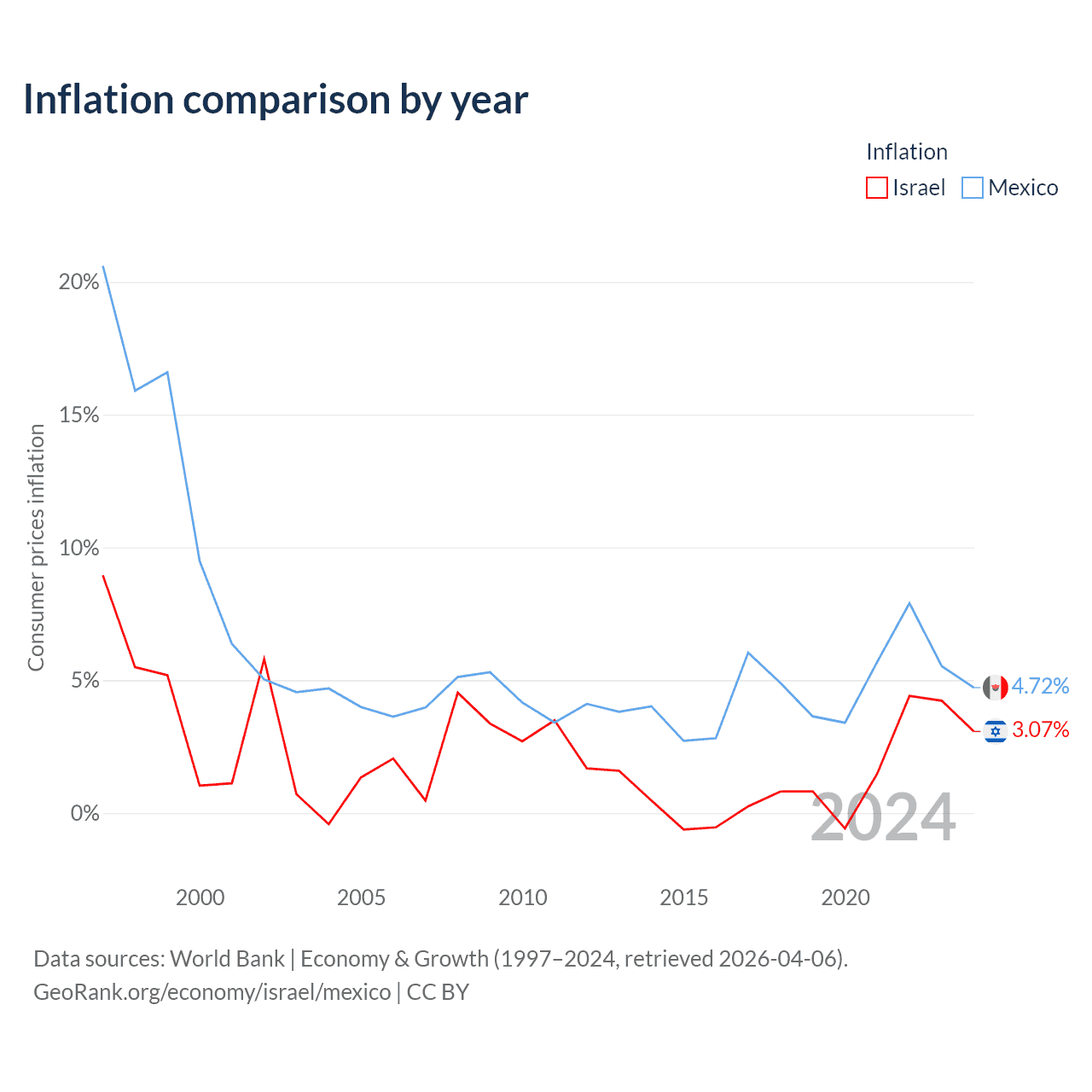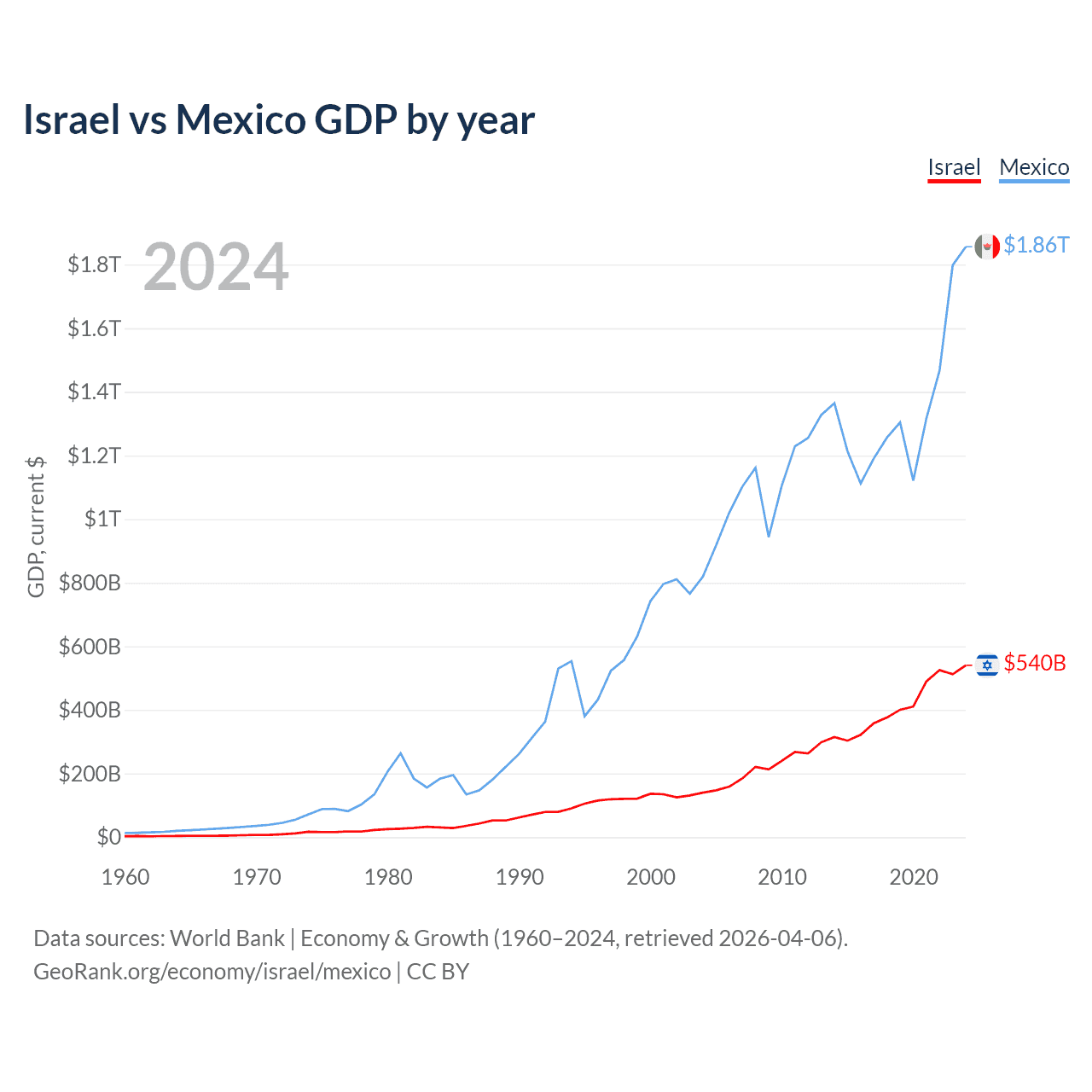 Israel has a GDP of $540B compared to $1.86T for Mexico, ranking 29/197 and 13/197 by economy size, respectively.