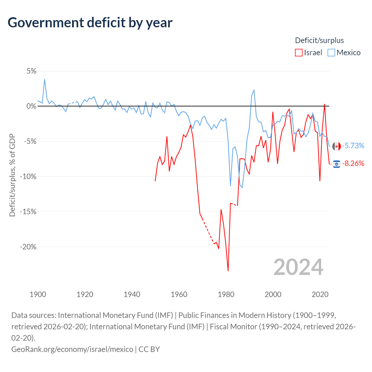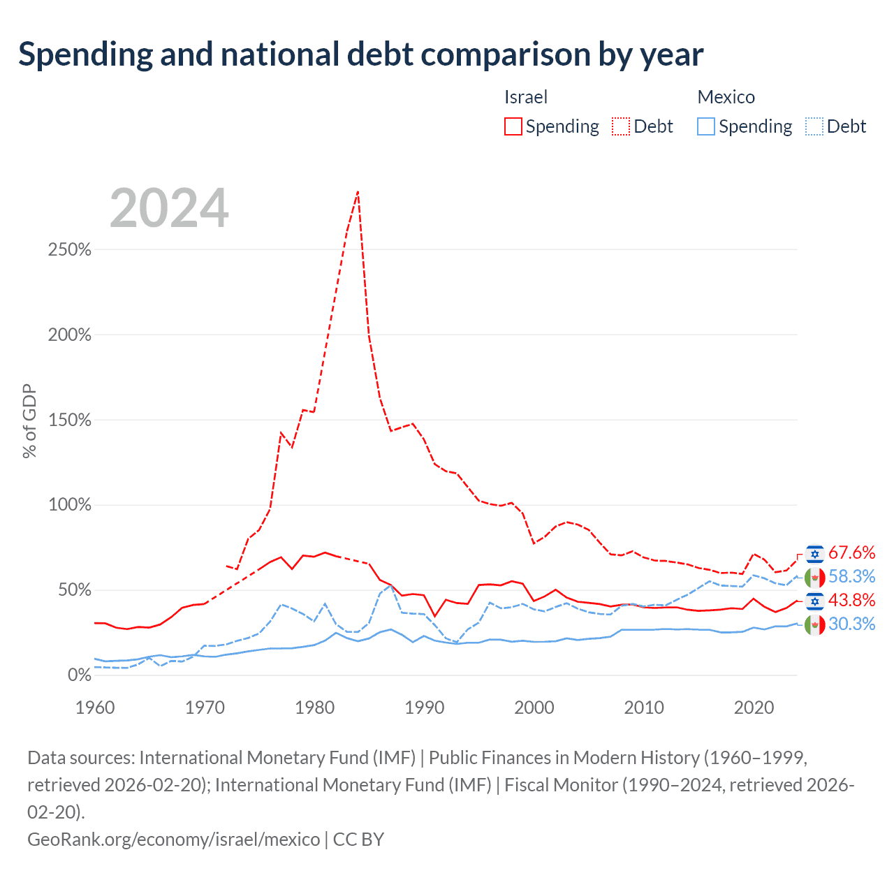 Israel has $366B in government debt (67.6% of GDP), compared to $1.08T (58.3% of GDP) in Mexico.