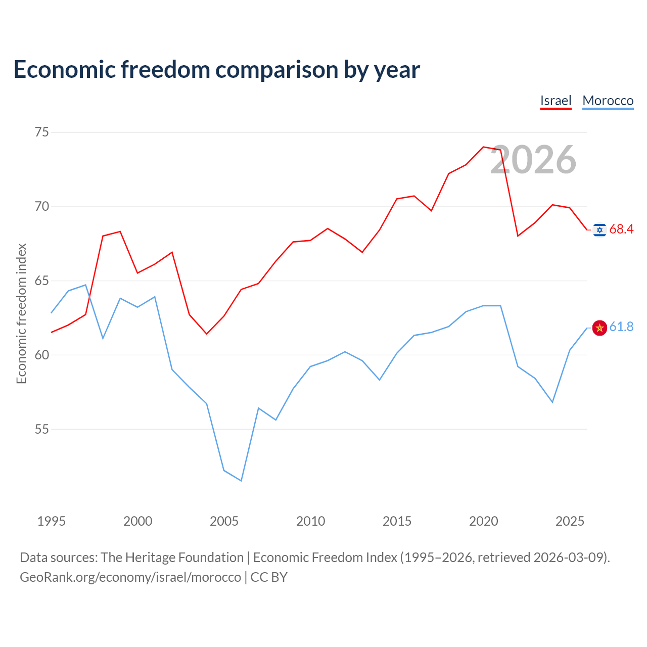 The Economic Freedom Index for Israel is 68.4, ranking 47/197, compared to 61.8 for Morocco, ranking 91/197. The chart above displays a comparison of annual changes in economic freedom indexes.
