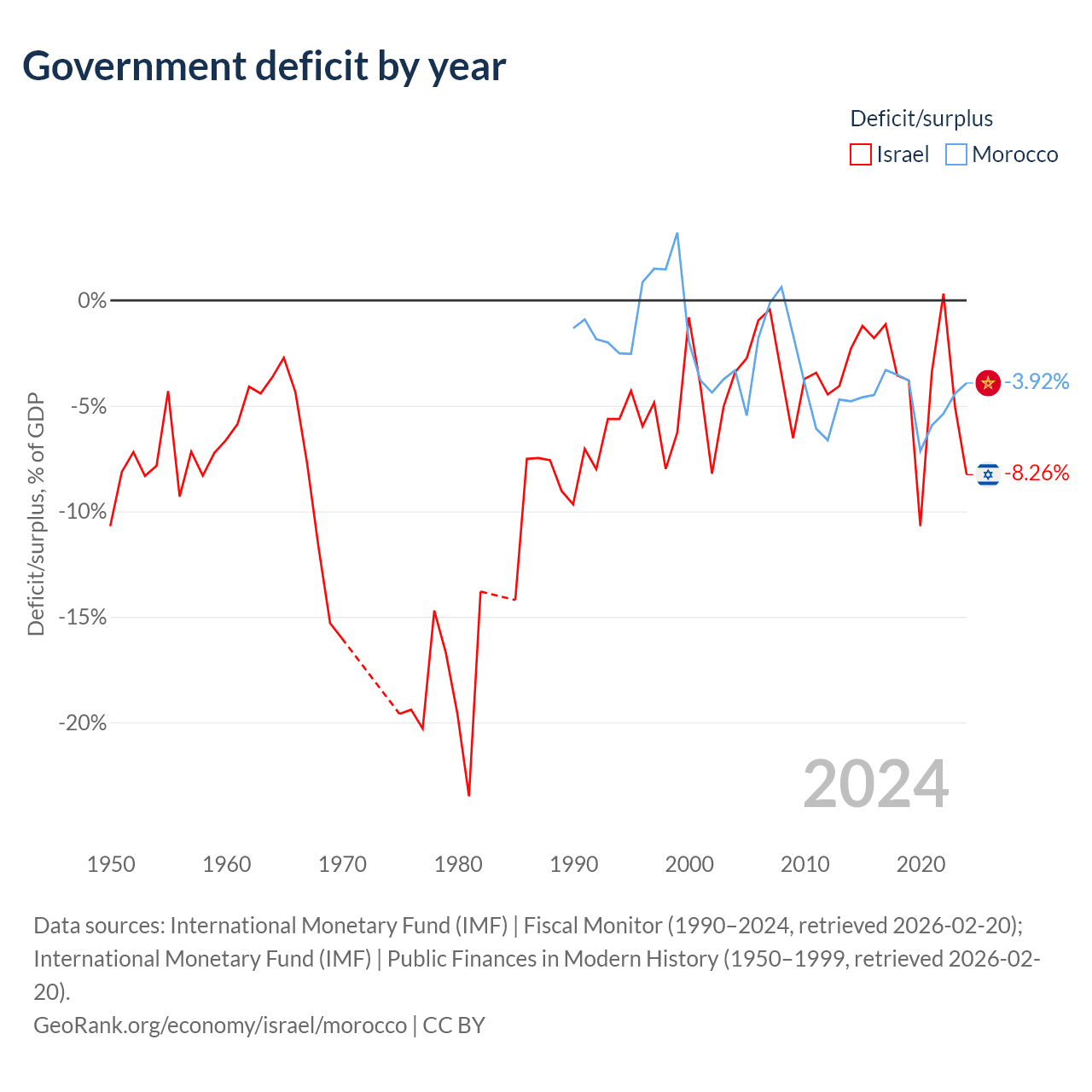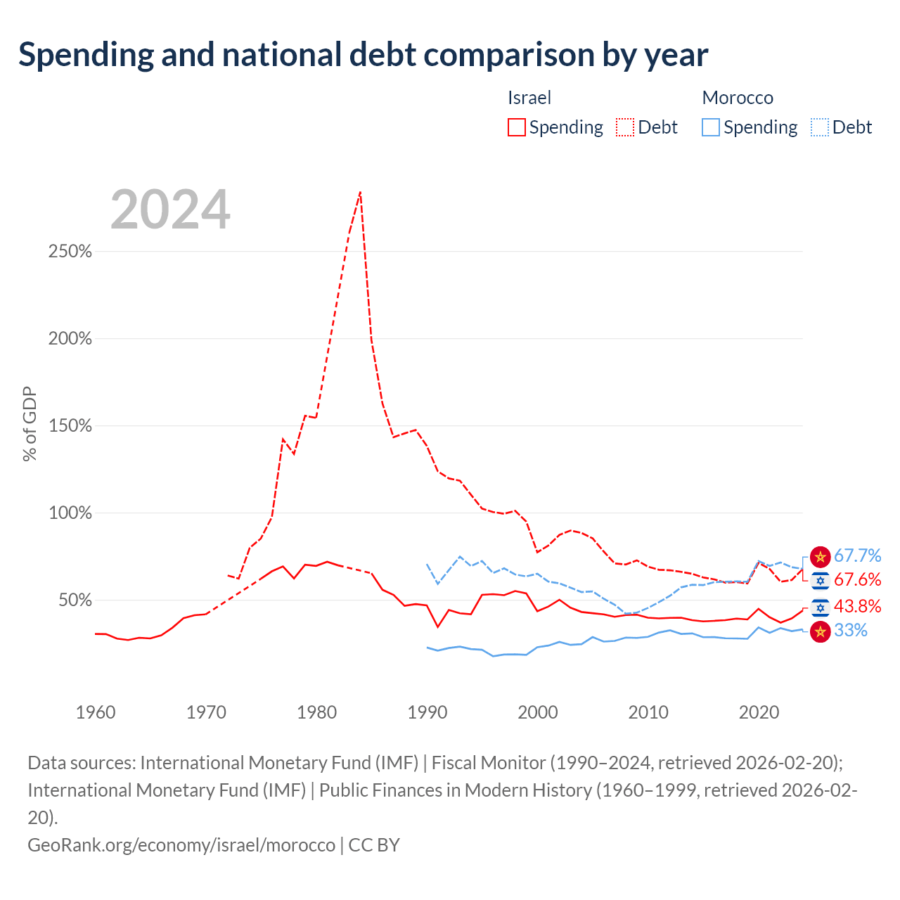 Israel has $366B in government debt (67.6% of GDP), compared to $109B (67.7% of GDP) in Morocco.